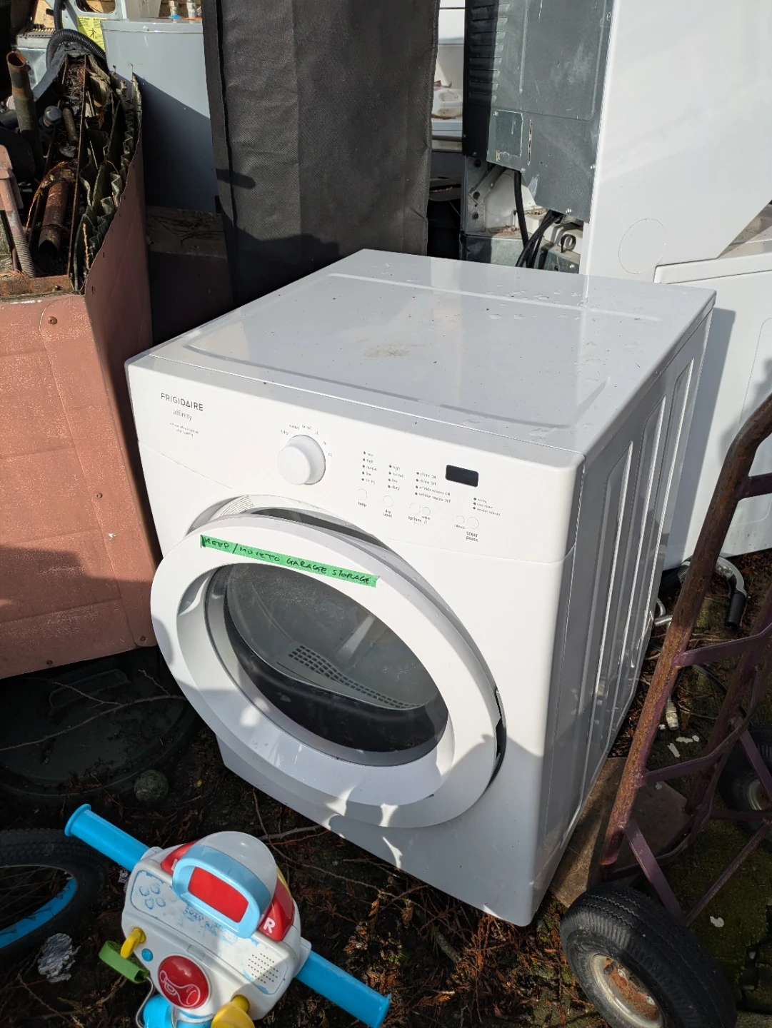 This is a white Frigidaire Affinity front-load gas dryer and washer It features multiple drying cycles and temperature settings. This dryer is stackable on top of the washer.