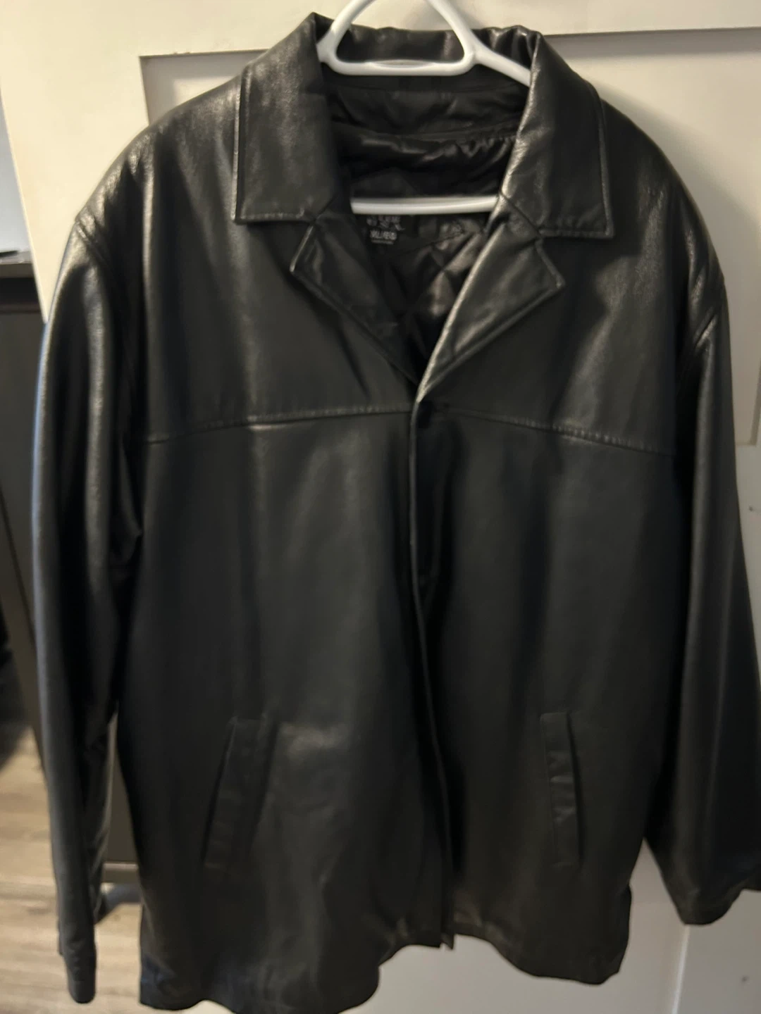 Selling a black leather jacket in size XL. It's in great condition and ready for a new owner. The jacket features a classic design and a comfortable fit, perfect for adding a stylish touch to your wardrobe.
