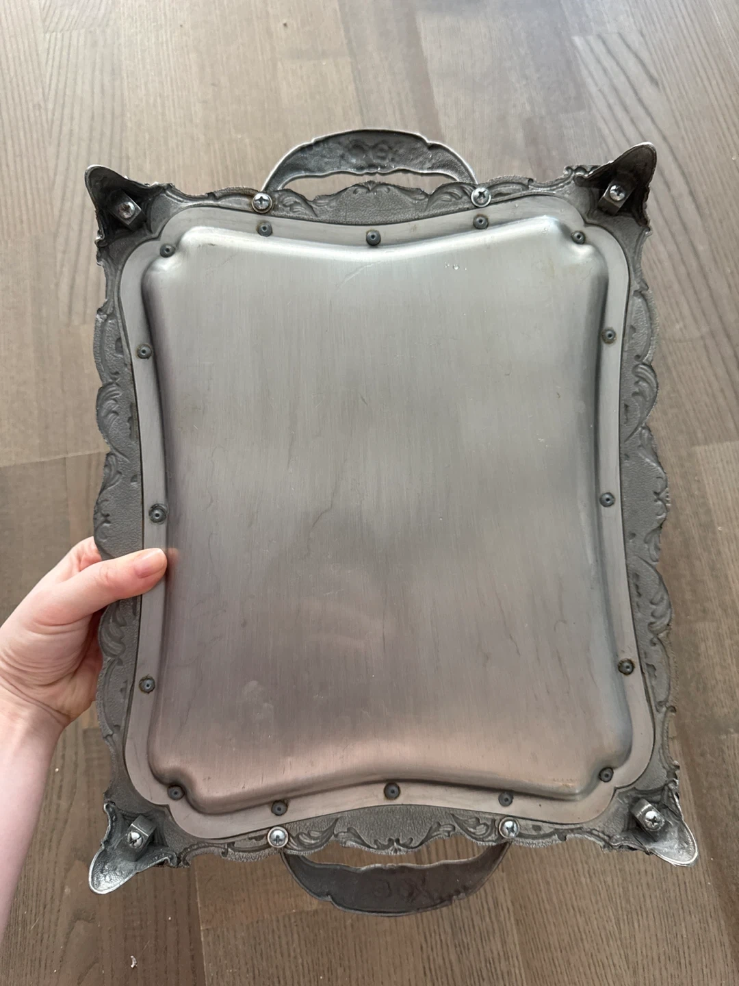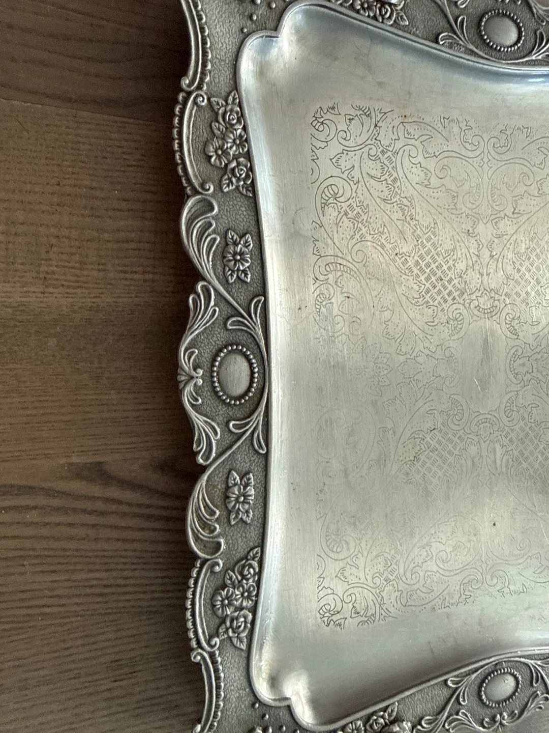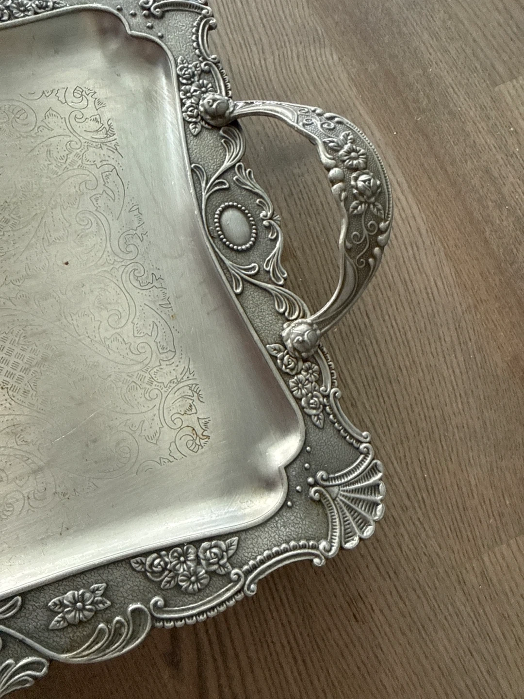 This decorative metal serving tray boasts an antique-inspired design with ornate floral detailing along the edges and handles. It's perfect for serving drinks or appetizers at gatherings. The sturdy construction ensures it can handle a good load.