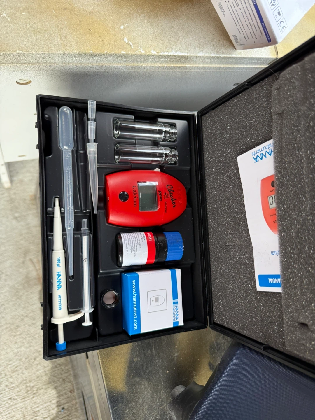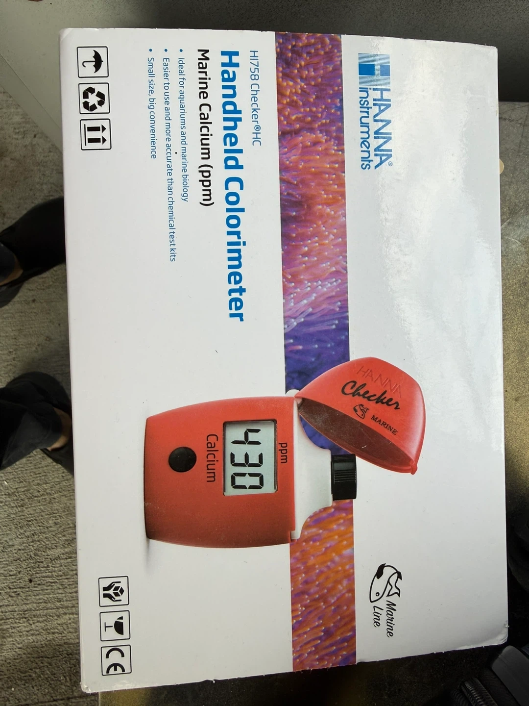 This handheld colorimeter is designed for marine calcium testing. It includes a meter, vials, pipettes, and reagents. Easy to use for accurate chemical tests in aquariums and marine biology. Small size, big convenience!