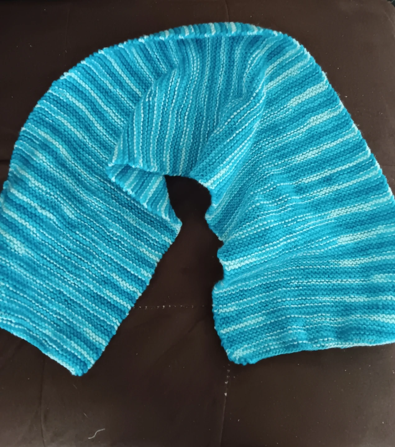This is a hand-knitted scarf. It's made from a soft yarn in multiple shades of blue. The scarf's knit pattern adds care & warmth in every stitch.