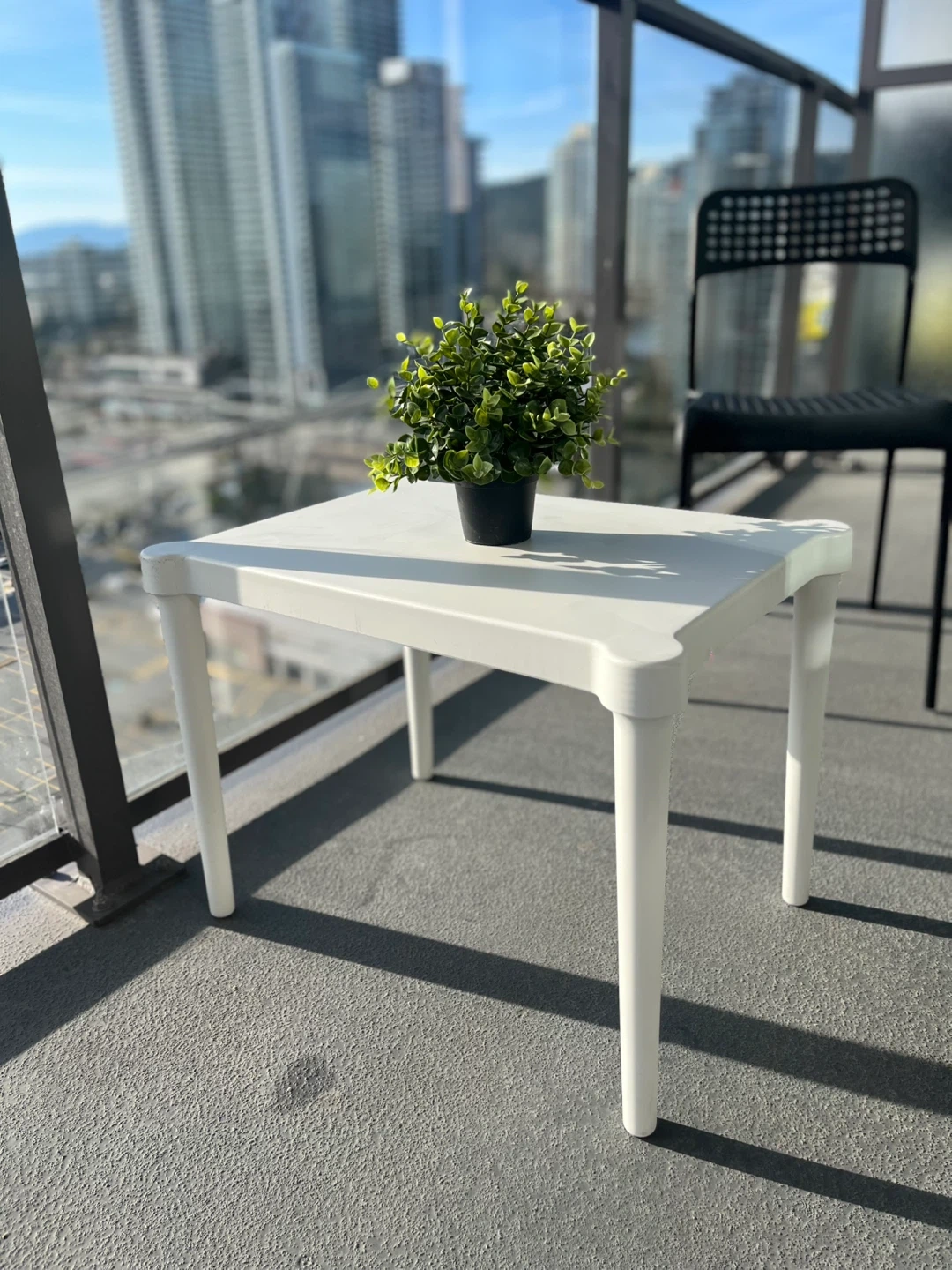This set includes one white plastic side table and two black chairs. You can buy the whole set for $40 or each item separately.