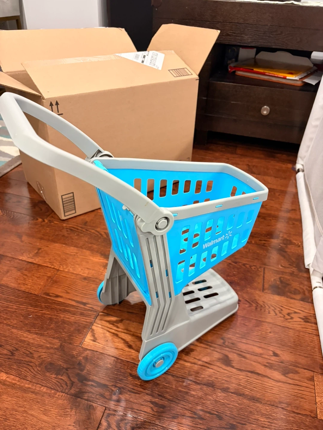 This bright blue and grey play shopping cart is perfect for little ones! It's made of durable plastic and features a lower basket for extra storage. Kids can enjoy hours of imaginative play with this fun toy!