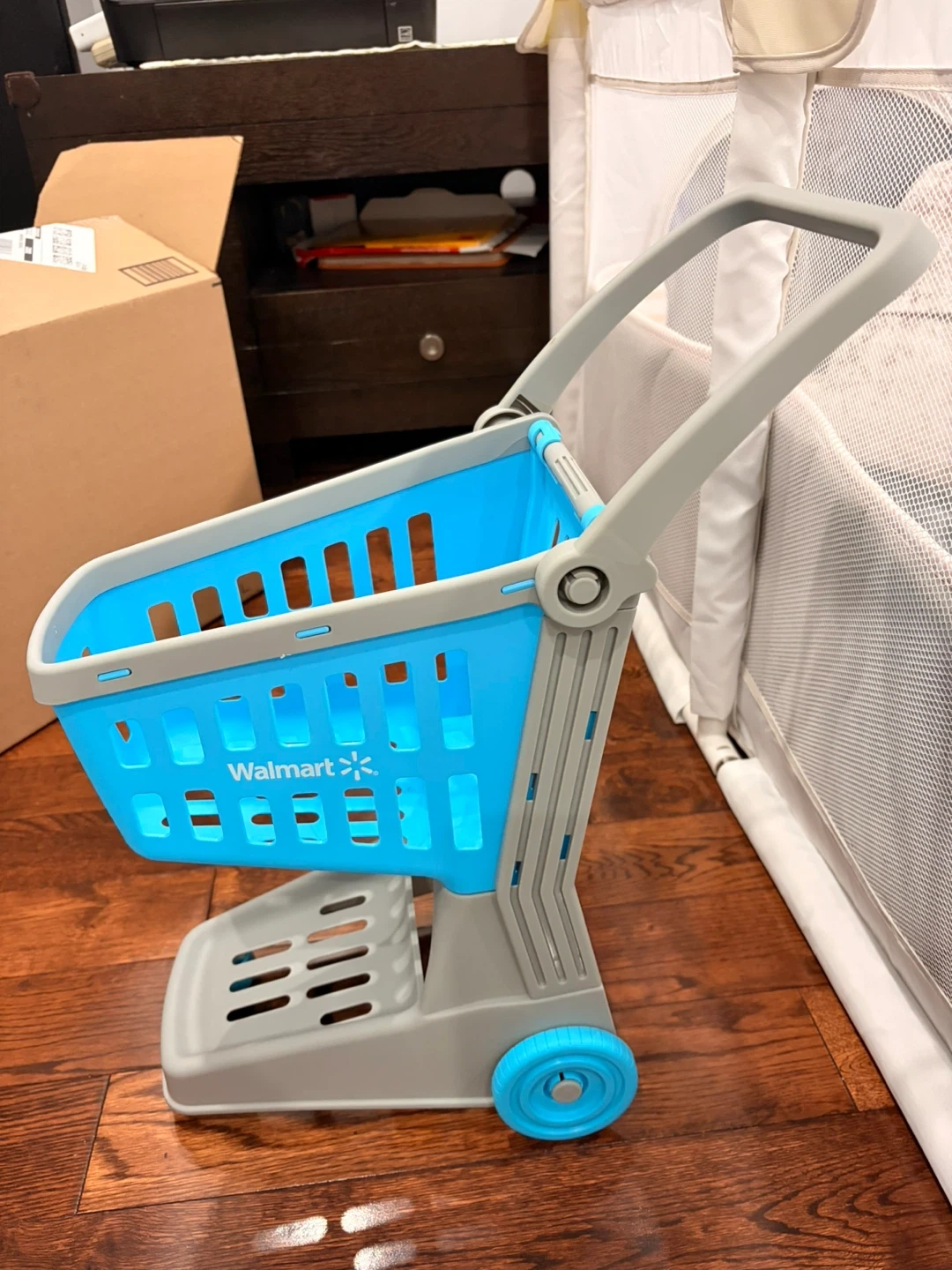 This bright blue and grey play shopping cart is perfect for little ones! It's made of durable plastic and features a lower basket for extra storage. Kids can enjoy hours of imaginative play with this fun toy!