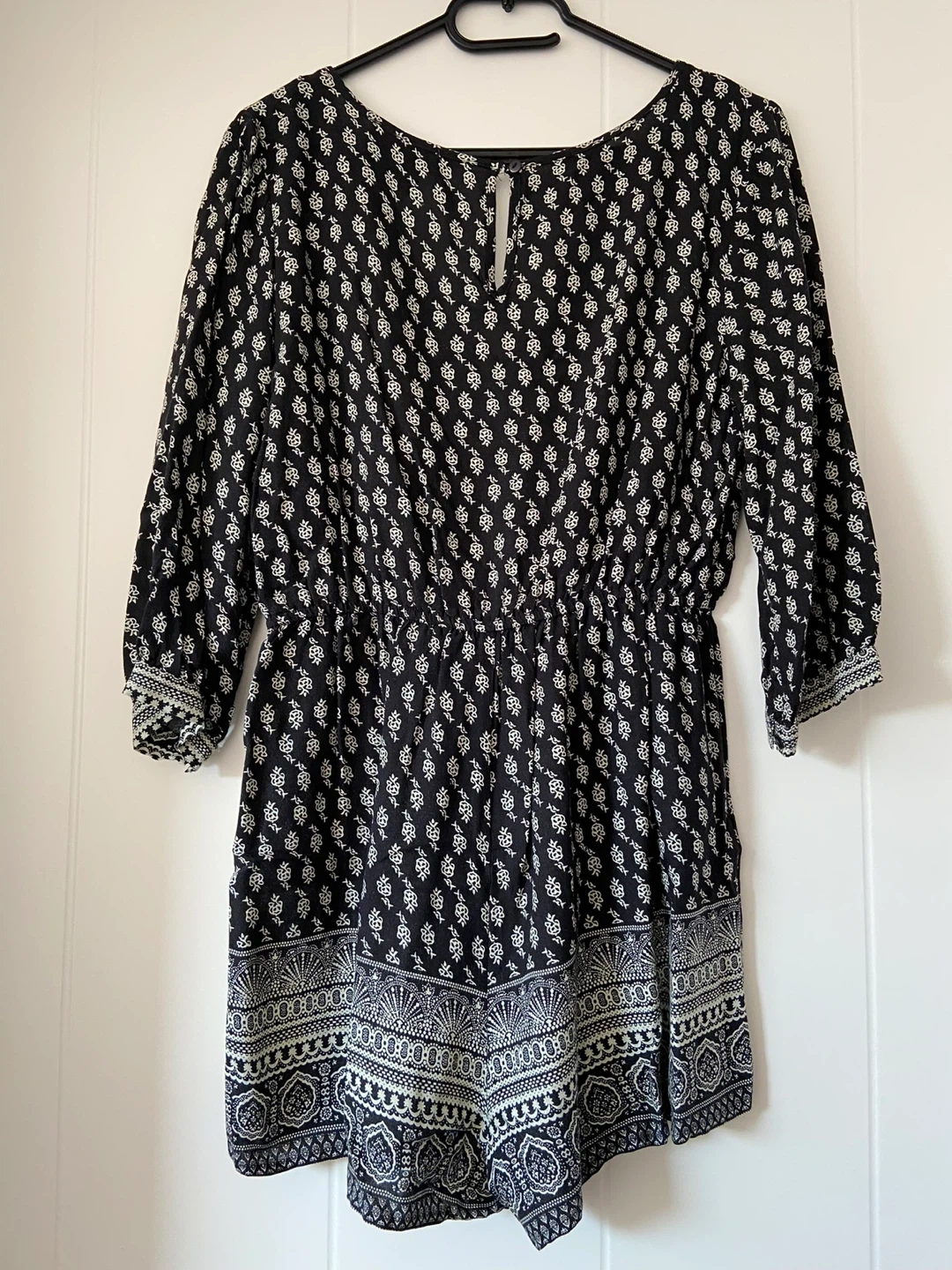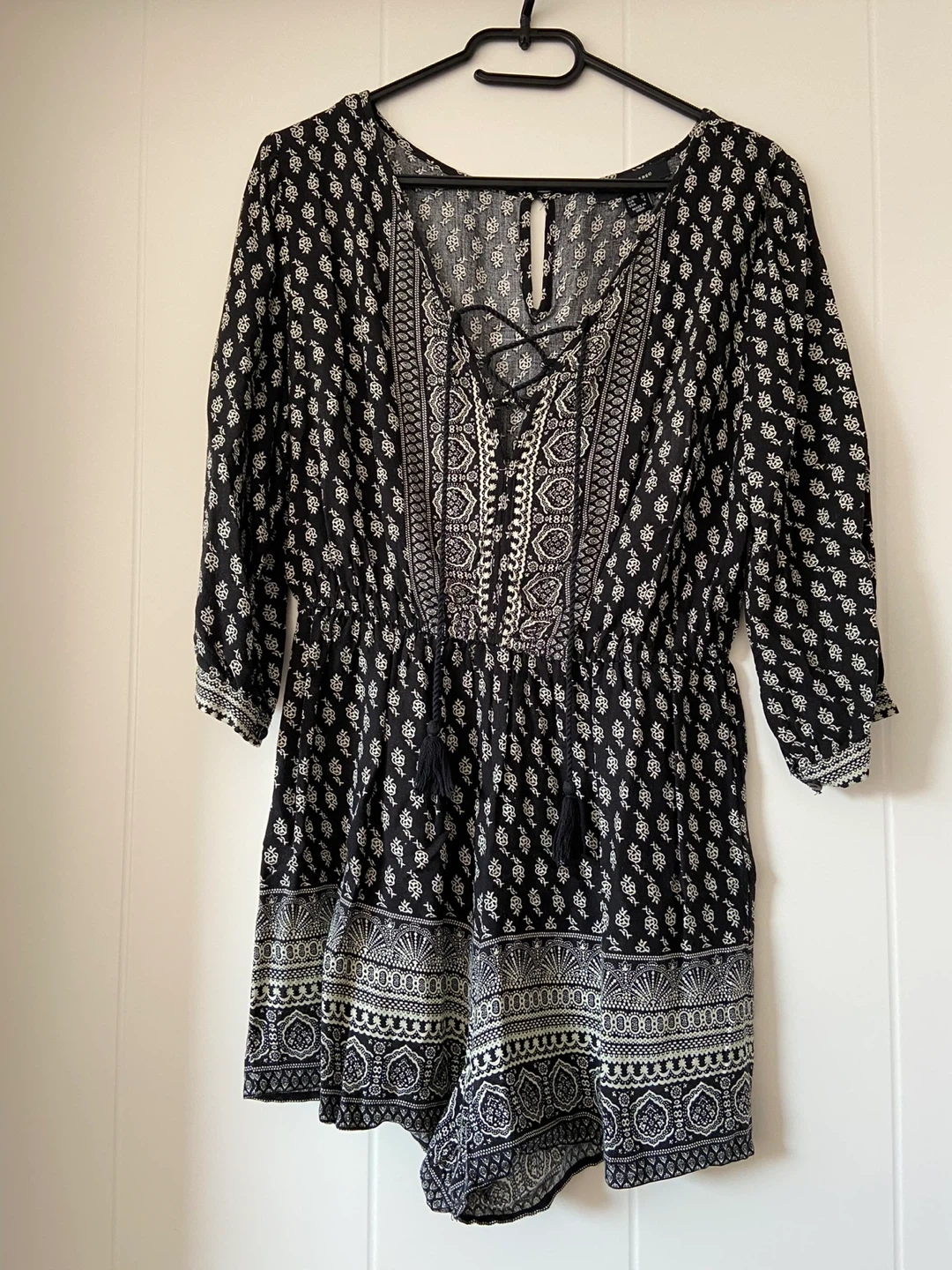 Cute black and white floral print romper with a lace-up neckline and elasticized waist