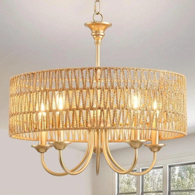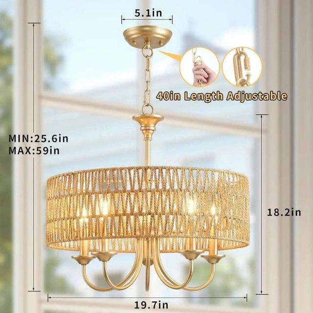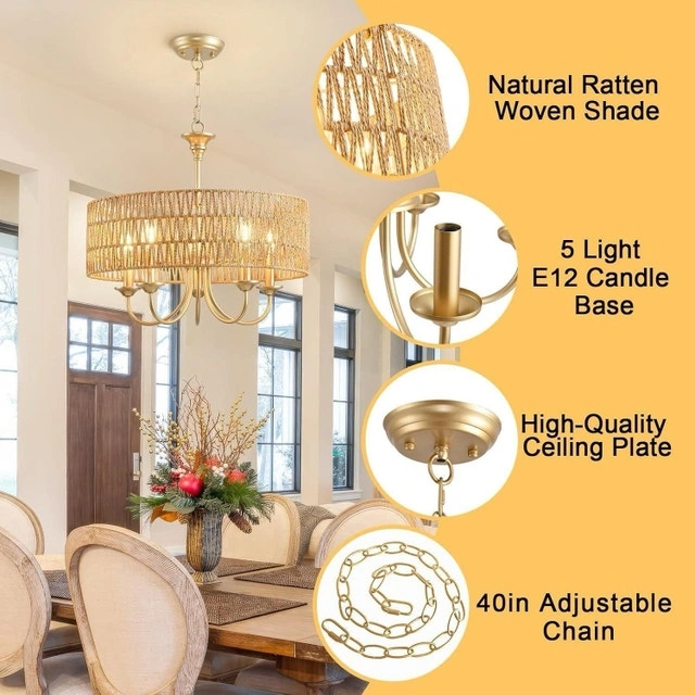 Illuminate your space with this stunning gold finish, natural rattan woven drum chandelier. It features five lights and an adjustable 40-inch chain for versatile hanging options. This chandelier is brand new in its original packaging. The drum shade adds a touch of rustic elegance, perfect for dining rooms, living rooms, or entryways. Give your home a warm and inviting glow with this charming fixture! Specifications: Natural Rattan Woven Shade, 5 Light E12 Candle Base, High-Quality Ceiling Plate, 40in Adjustable Chain. If the ad is up, it's still available!