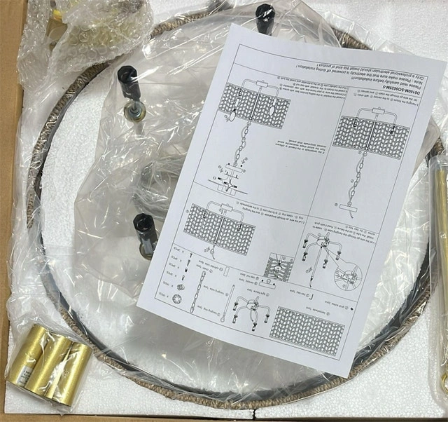 Illuminate your space with this stunning gold finish, natural rattan woven drum chandelier. It features five lights and an adjustable 40-inch chain for versatile hanging options. This chandelier is brand new in its original packaging. The drum shade adds a touch of rustic elegance, perfect for dining rooms, living rooms, or entryways. Give your home a warm and inviting glow with this charming fixture! Specifications: Natural Rattan Woven Shade, 5 Light E12 Candle Base, High-Quality Ceiling Plate, 40in Adjustable Chain. If the ad is up, it's still available!