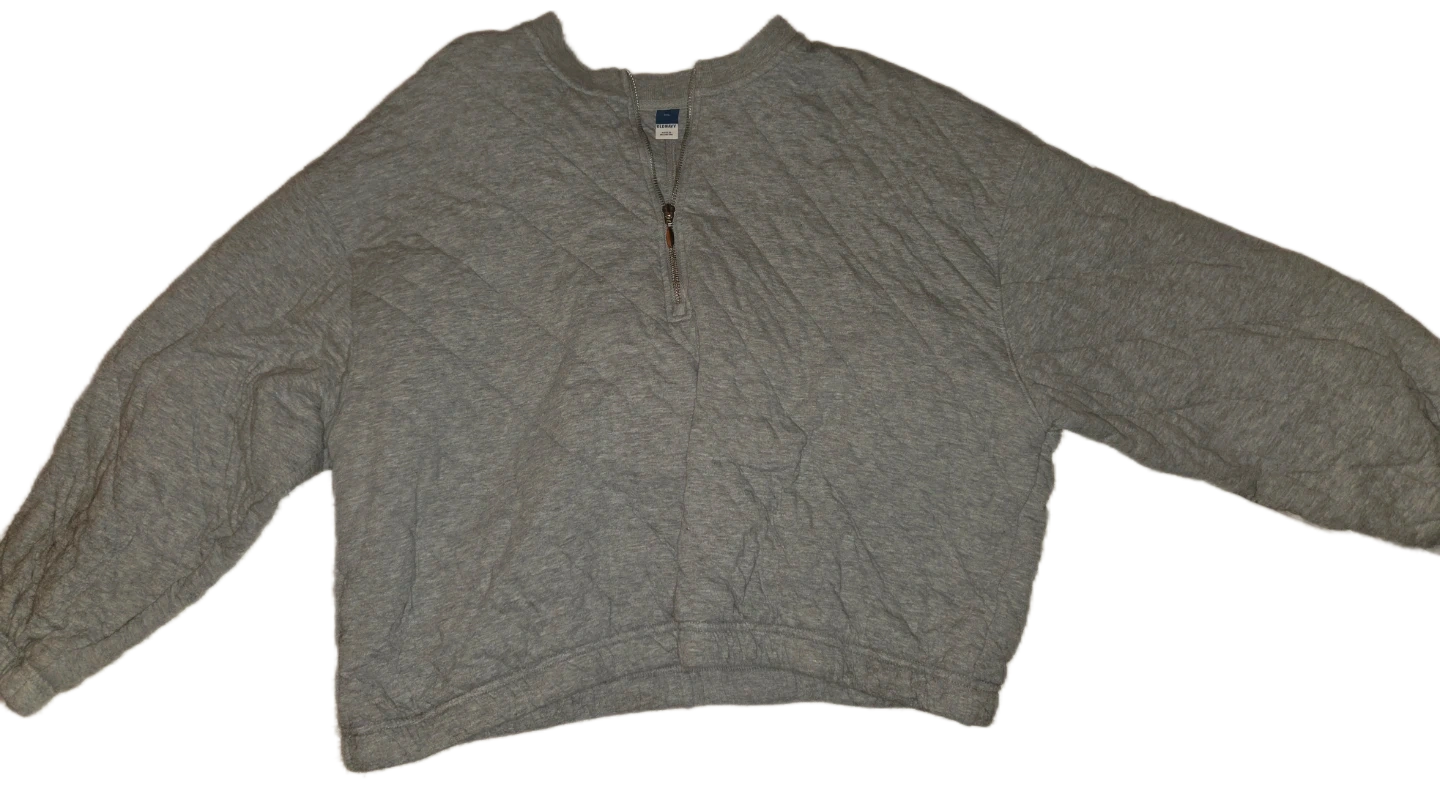 This is a grey quilted quarter-zip sweatshirt from Old Navy. It's made of a cotton blend fabric. Crewneck with quarter-zip closure. Ribbed cuffs and hem.