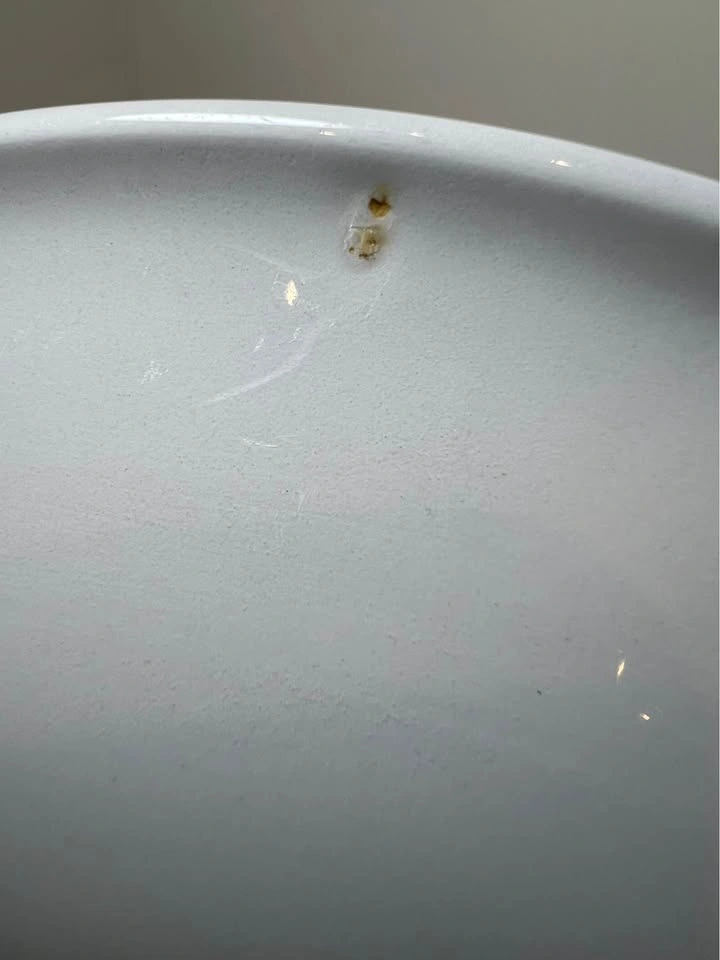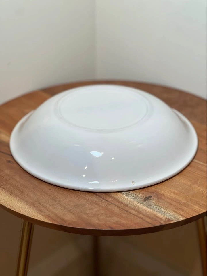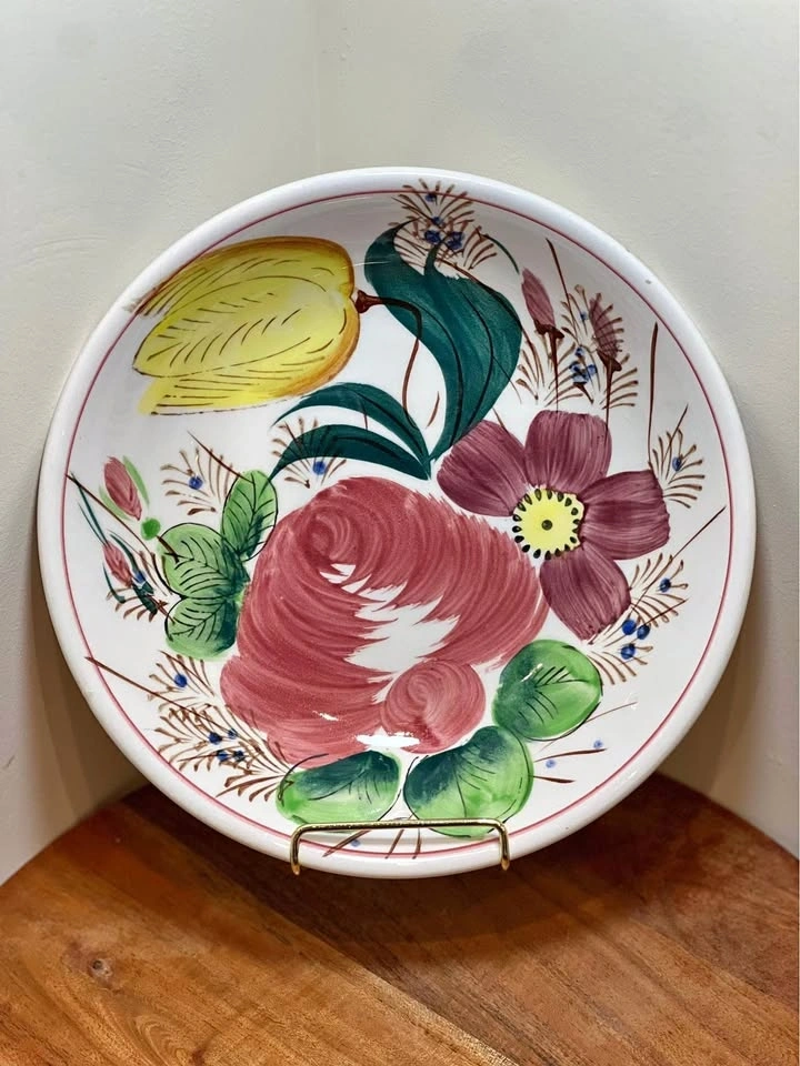 This is a vintage hand-painted floral serving bowl, often referred to as Ironstone Ware or Italian Faience style. These pieces are known for their vibrant, "shabby chic" folk art aesthetic, featuring a large central rose, yellow tulips, and deep purple flowers. Pattern: Often identified as Nove Rose or Nove Rose Tulip. Design: A rustic, folk-art style featuring a large central pink rose, a vibrant yellow tulip, and smaller purple blossoms with green foliage. Material: Commonly found in Ironstone Ware (often made in Japan) or Italian Majolica/Faience. Uses: These are multi-purpose bowls suitable for serving pasta, salads, or fruit, and are popular as decorative display pieces. Dimensions: approximately 9.25” diameter. Preowned. Pickup is 58th and 7th Ave in midtown Manhattan.