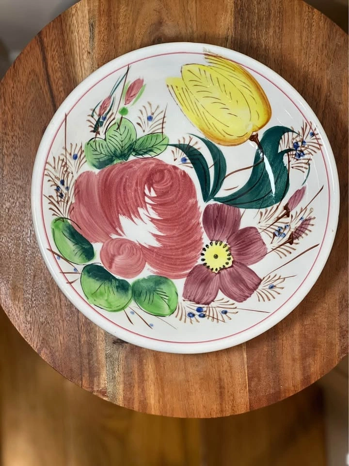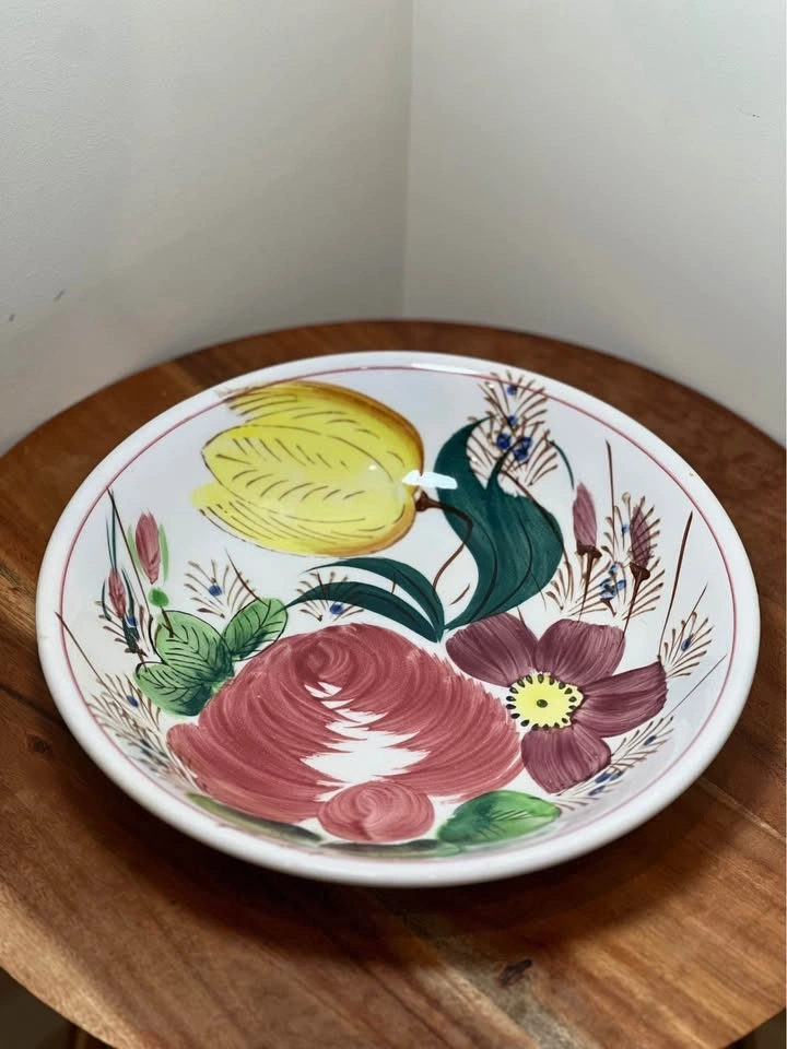 This is a vintage hand-painted floral serving bowl, often referred to as Ironstone Ware or Italian Faience style. These pieces are known for their vibrant, "shabby chic" folk art aesthetic, featuring a large central rose, yellow tulips, and deep purple flowers. Pattern: Often identified as Nove Rose or Nove Rose Tulip. Design: A rustic, folk-art style featuring a large central pink rose, a vibrant yellow tulip, and smaller purple blossoms with green foliage. Material: Commonly found in Ironstone Ware (often made in Japan) or Italian Majolica/Faience. Uses: These are multi-purpose bowls suitable for serving pasta, salads, or fruit, and are popular as decorative display pieces. Dimensions: approximately 9.25” diameter. Preowned. Pickup is 58th and 7th Ave in midtown Manhattan.