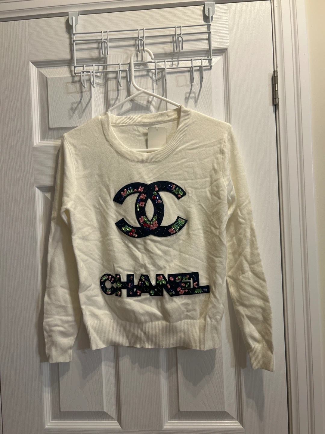 This cream-coloured sweater features the iconic Chanel CC logo embellished with floral sequin details. The word CHANEL is also spelled out with matching sequins at the bottom. It's a stylish pullover knit. A lovely piece for anyone's wardrobe!