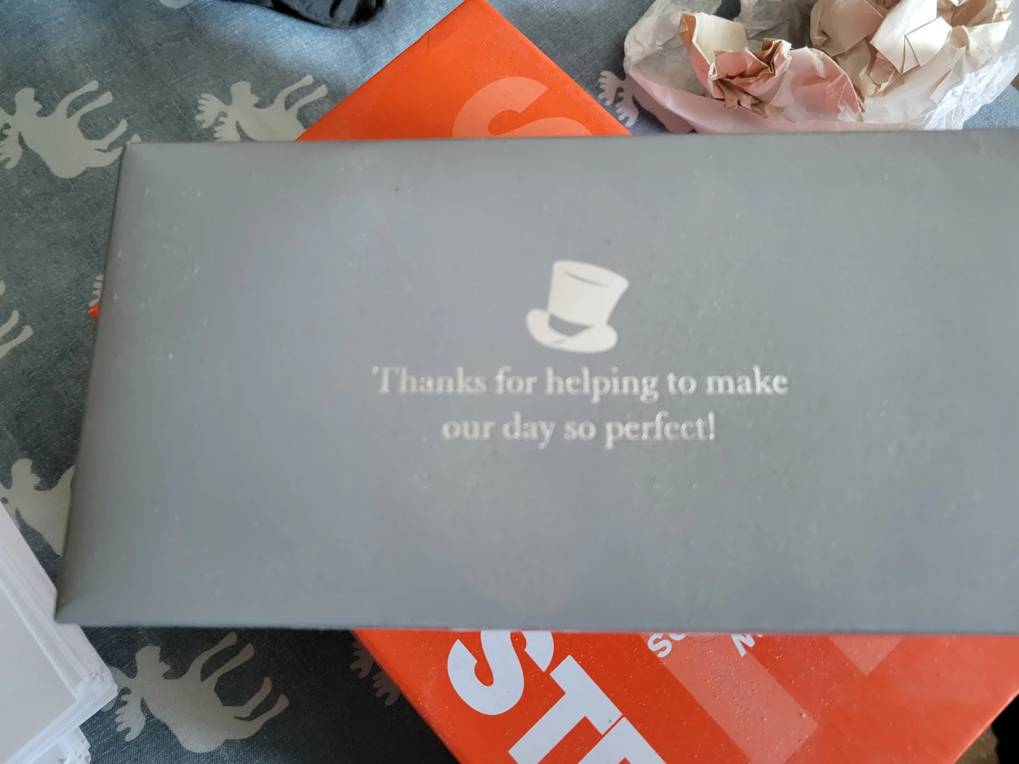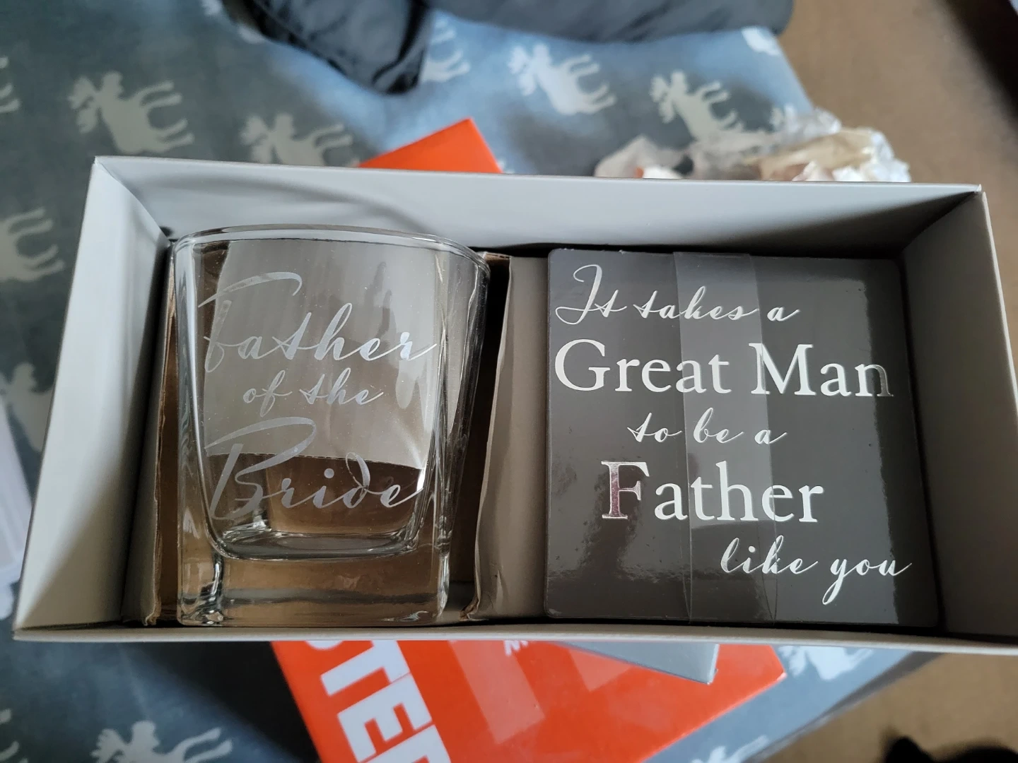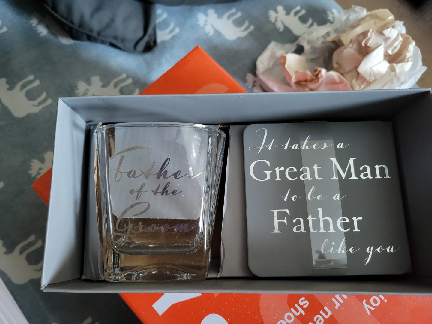 This gift set includes a shot glass engraved with 'Father of the Groom/ bride' and four coasters with the sentiment 'It takes a Great Man to be a Father like you'. The box also has a message 'Thanks for helping to make our day so perfect!'. It's a thoughtful present for a wedding.