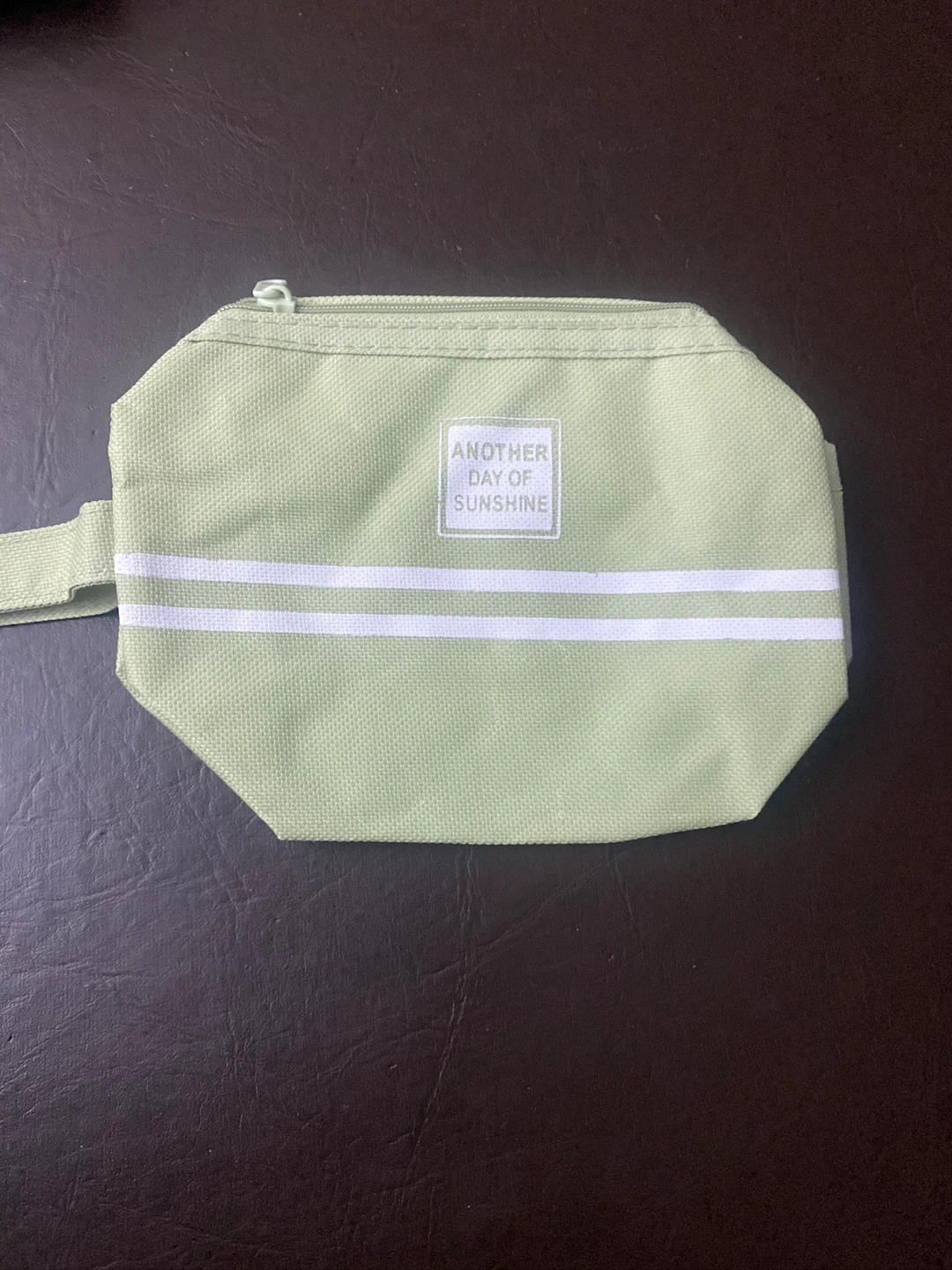 This light green zippered pouch features the text "ANOTHER DAY OF SUNSHINE". It has a canvas-like material with white stripe accents. It's perfect for organizing small items like pens or makeup.