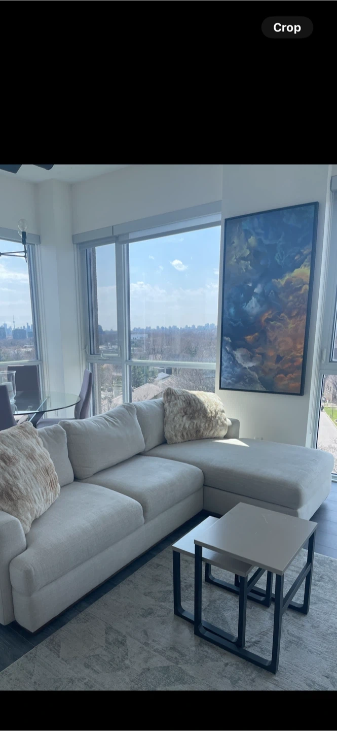 This large framed canvas art piece features a dramatic abstract cloudscape. It's painted with a mix of deep blues, greys, and warm oranges. Adds a bold statement to any room!
