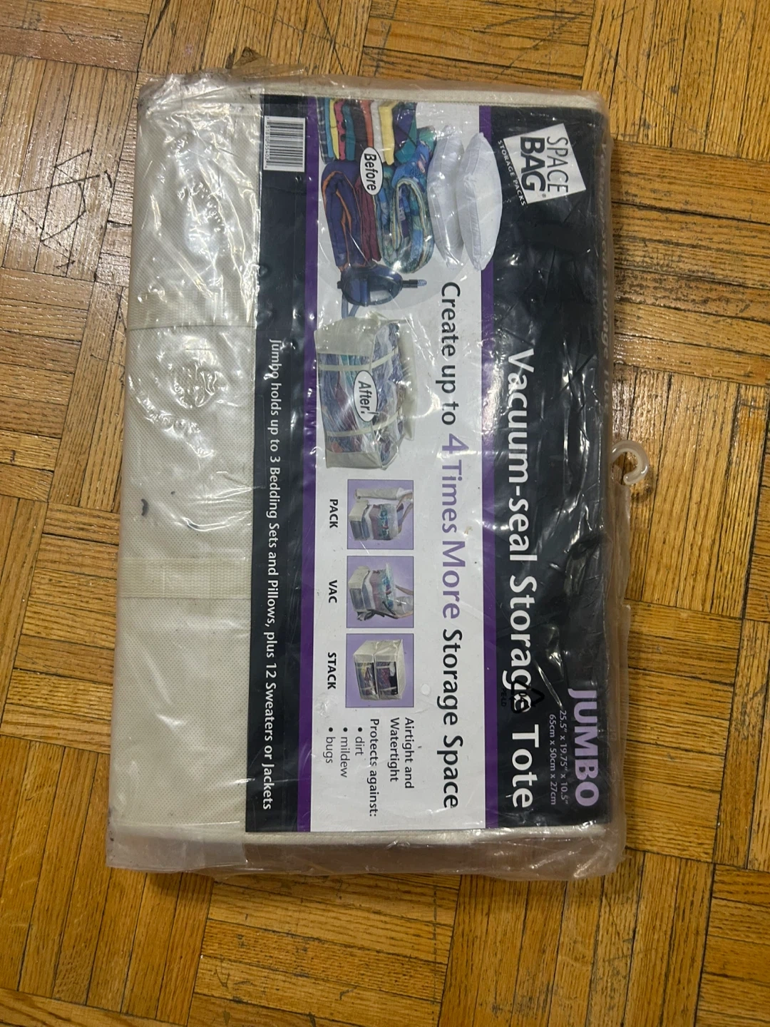 This jumbo vacuum-seal storage tote creates up to 4 times more storage space. It's airtight and watertight, protecting against dirt, mildew, and bugs. Jumbo holds up to 3 bedding sets and pillows, plus 12 sweaters or jackets.