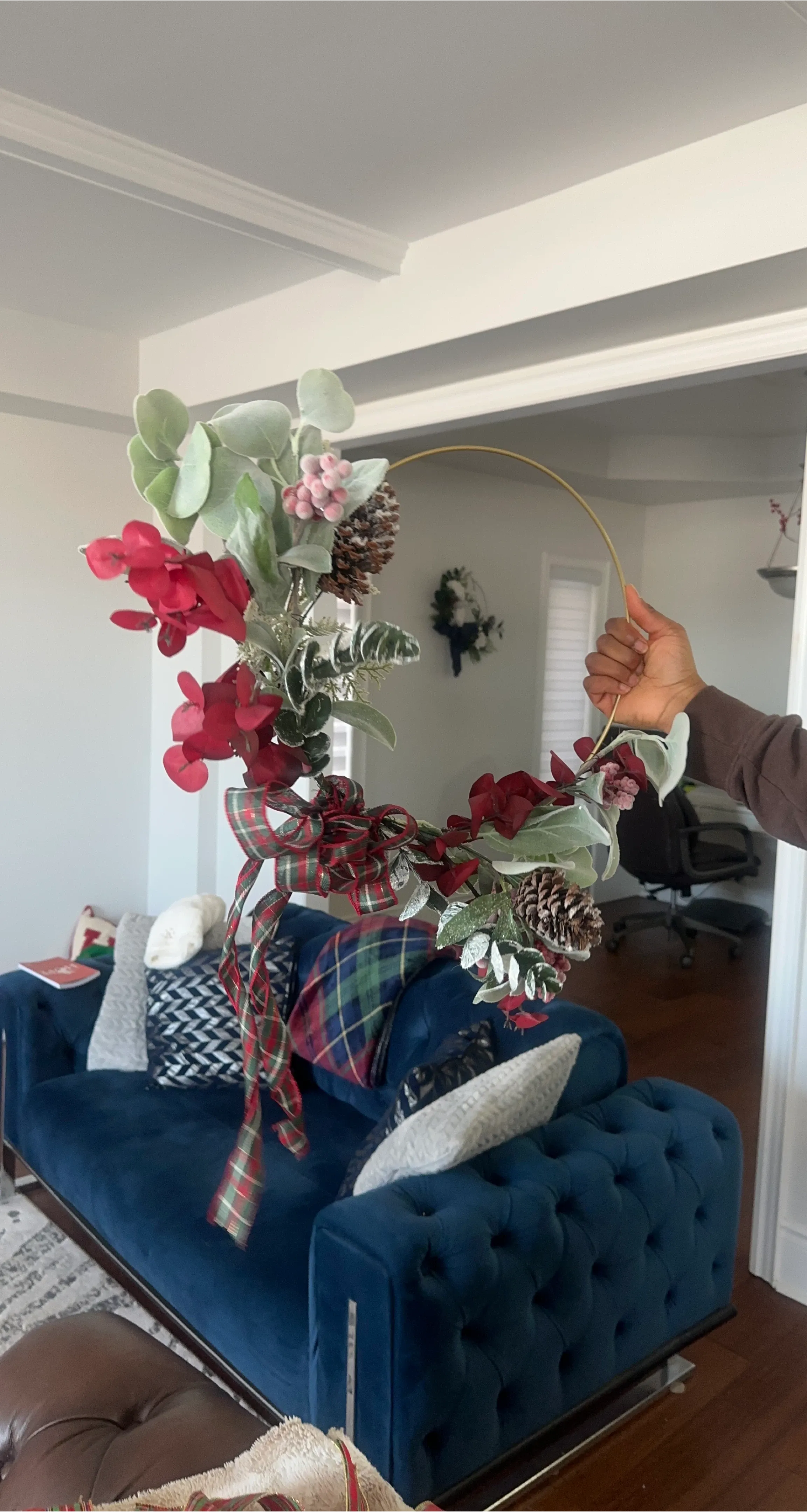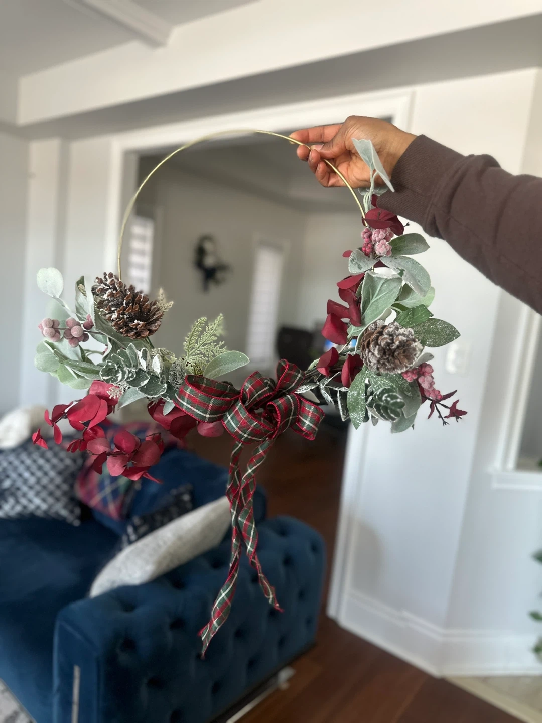 This festive handmade hoop wreath features a mix of greenery, red berries, pinecones, and a plaid ribbon. It's elegantly adorned with a gold metal hoop base. This wreath is perfect for adding a touch of holiday cheer to your home!
