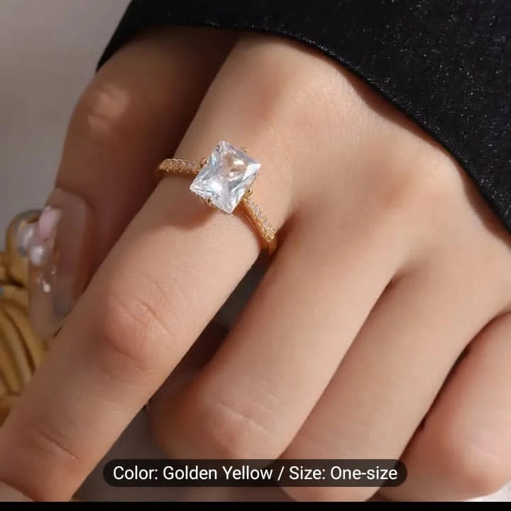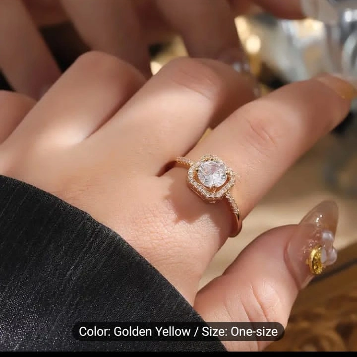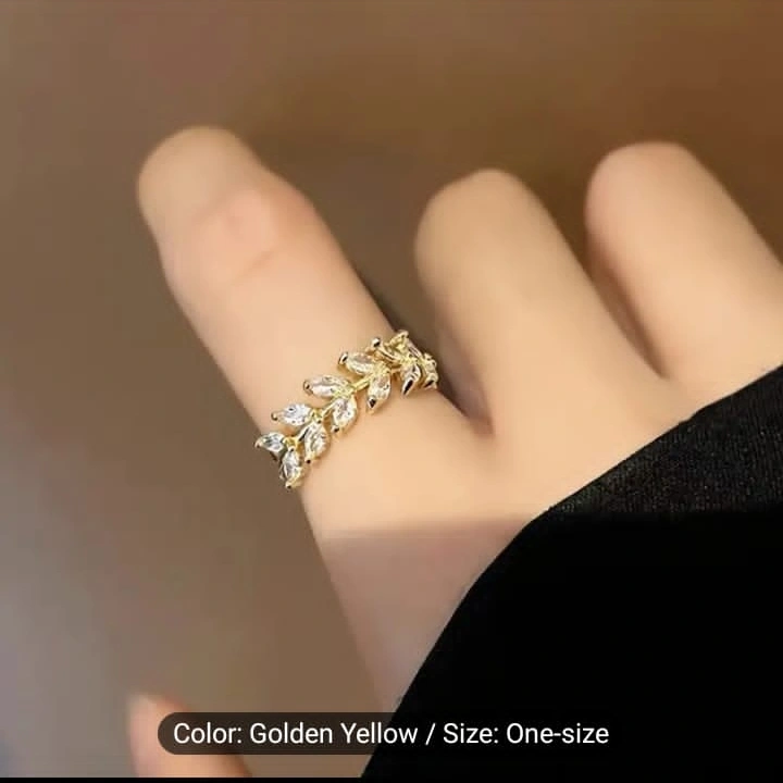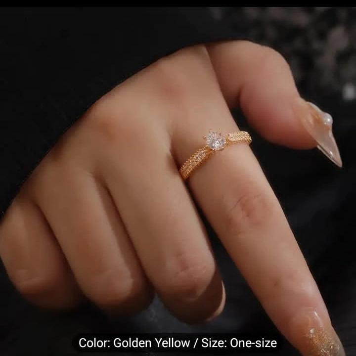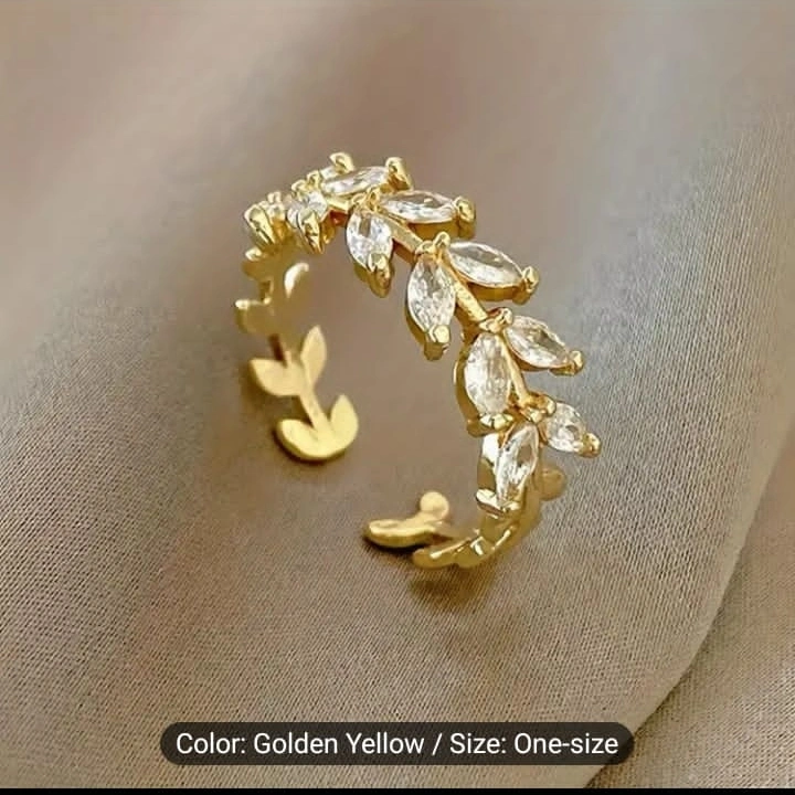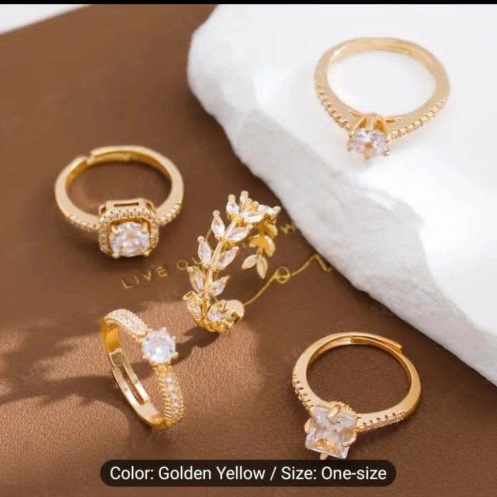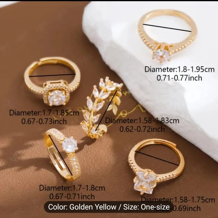 Five gold rings. Features various styles and clear stones. One-size-fits-most. Perfect for layering or individual wear.