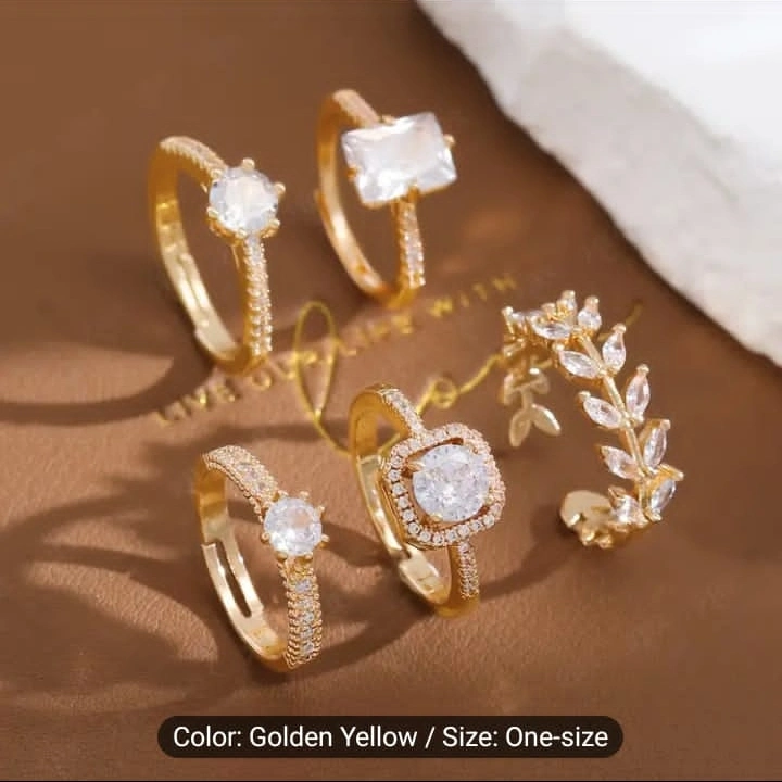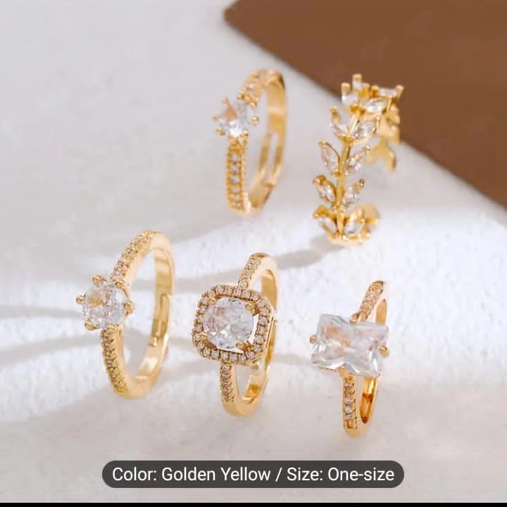 Five gold rings. Features various styles and clear stones. One-size-fits-most. Perfect for layering or individual wear.