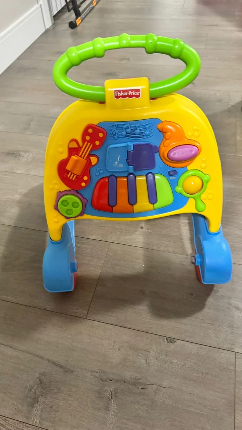 Fisher-Price baby walker with musical and interactive toys. It has colourful keys, a guitar, and spinning gears. This walker is designed for little ones learning to stand and cruise.