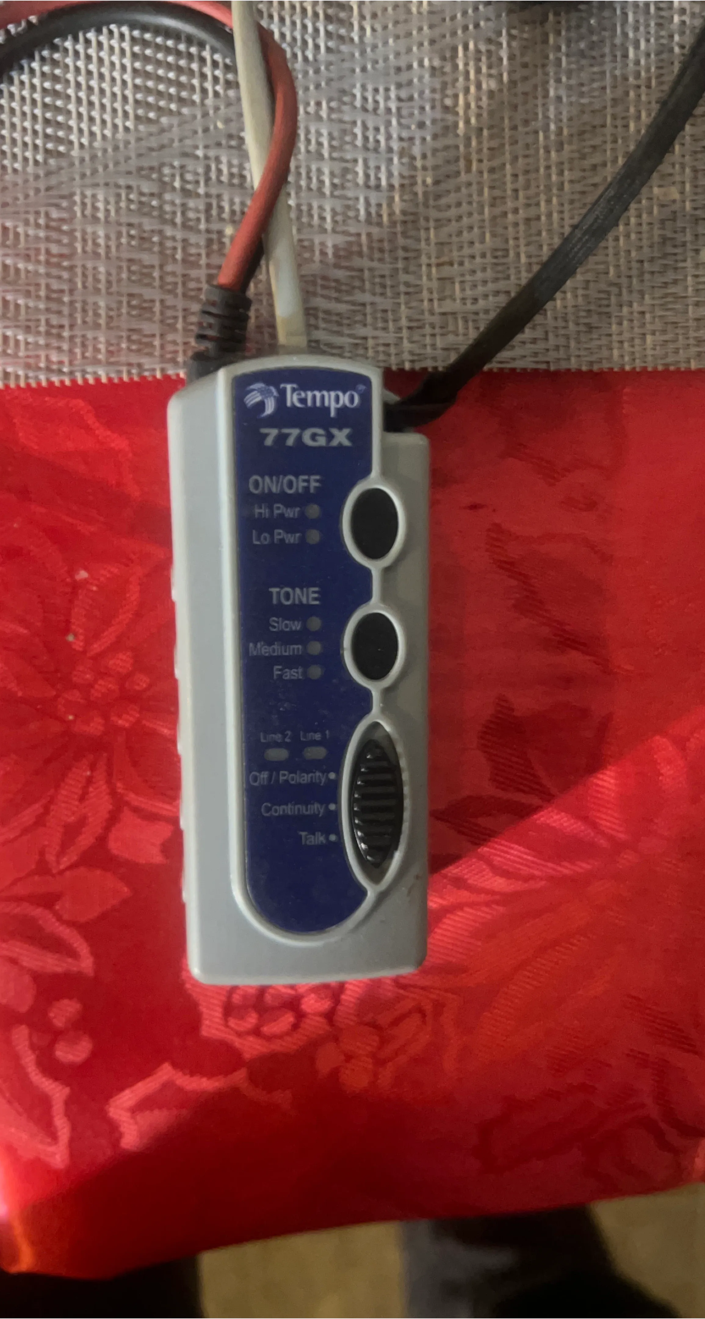 Selling a Tempo 77GX Tone and Continuity Tester. It has settings for ON/OFF, Hi Pwr, and Lo Pwr. It also has tone settings for slow, medium, and fast. It can test line 1 and line 2, and has settings for off/polarity, continuity, and talk