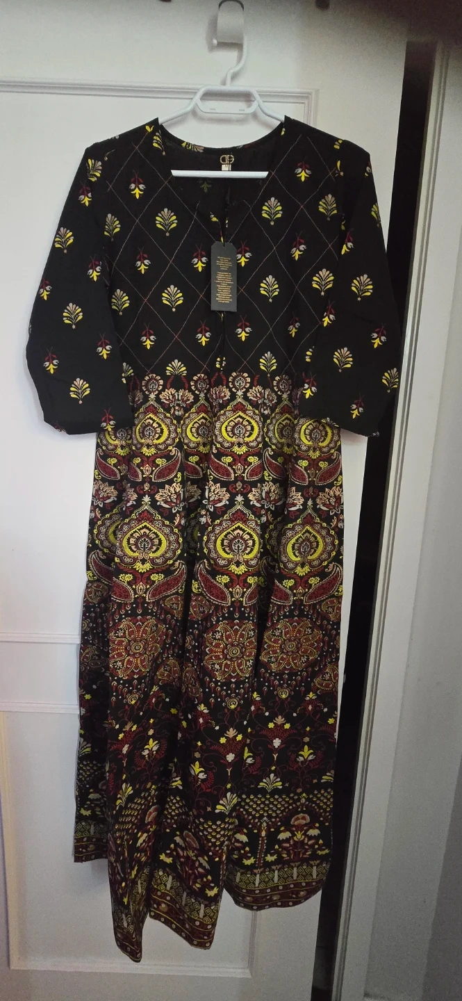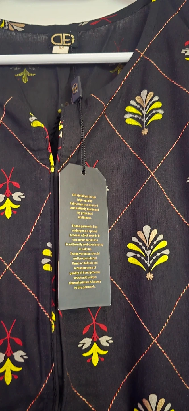 This is a DIL brand kurti with a floral and paisley print. It's a size medium. The garment is made of fabric known for its quality.