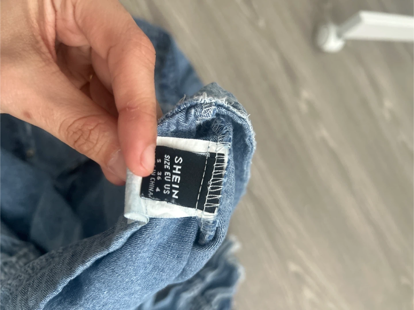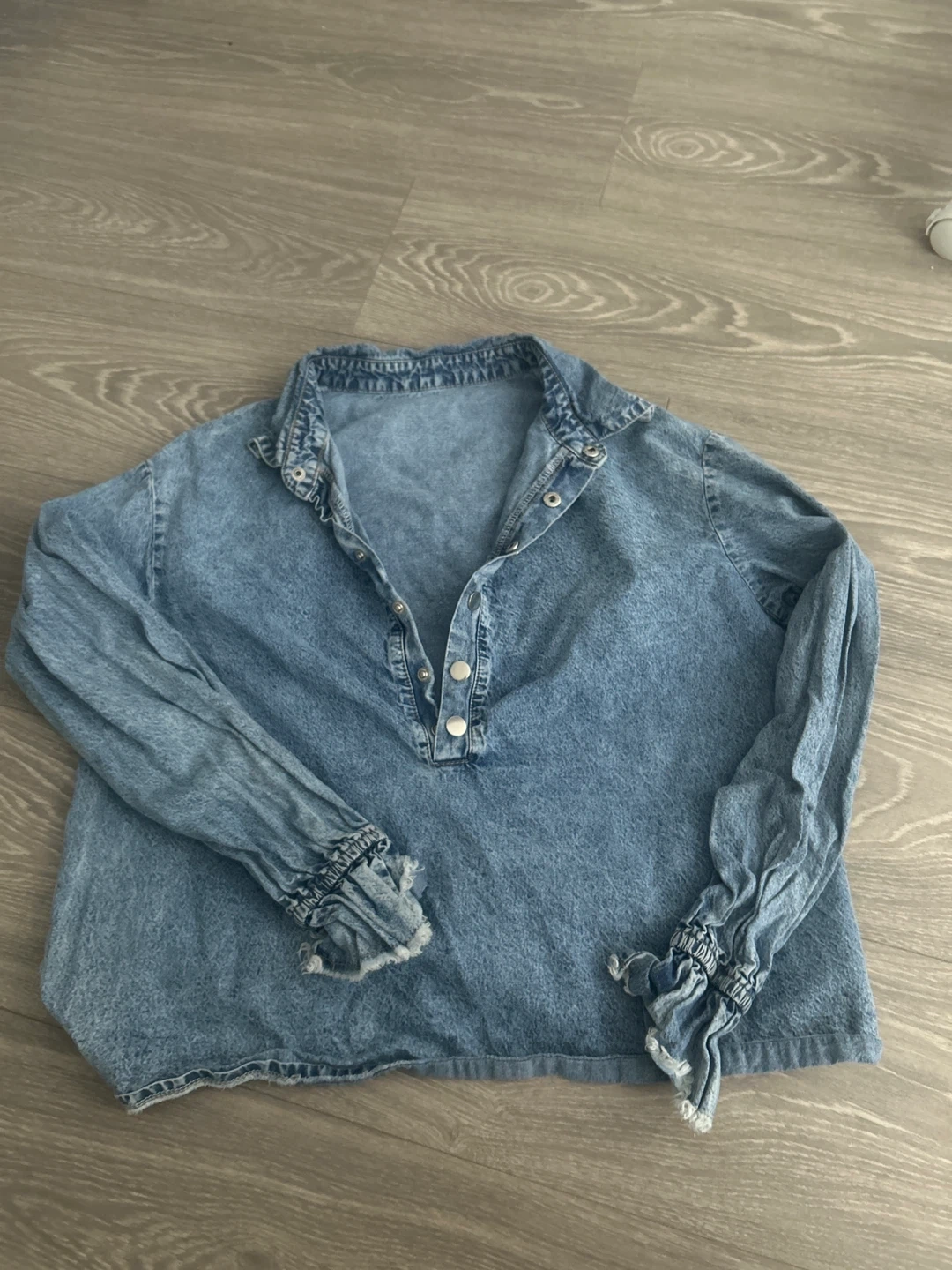 A SHEIN blue denim shirt with a button-up front. It has long sleeves with ruffled cuffs. Made from denim material. Size is small.