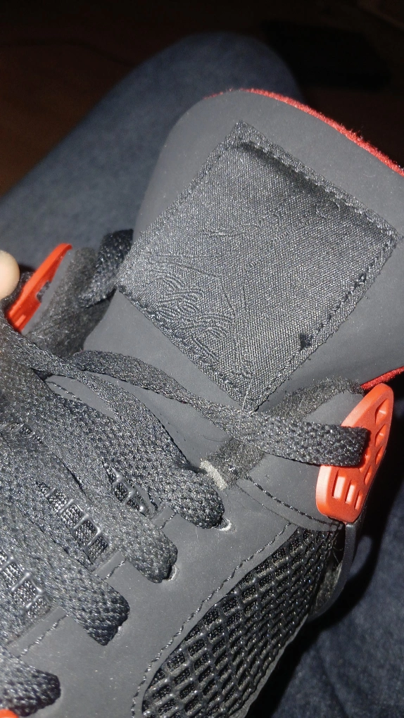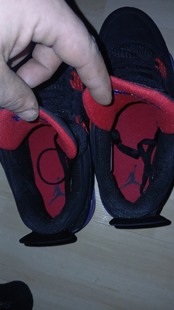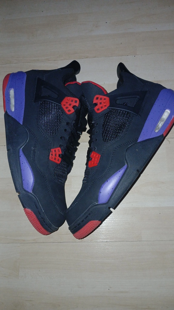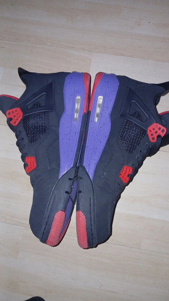 Men's Air Jordan 4 sneakers. Black suede upper, red accents, purple outsole. Pre-owned, size not specified. reps