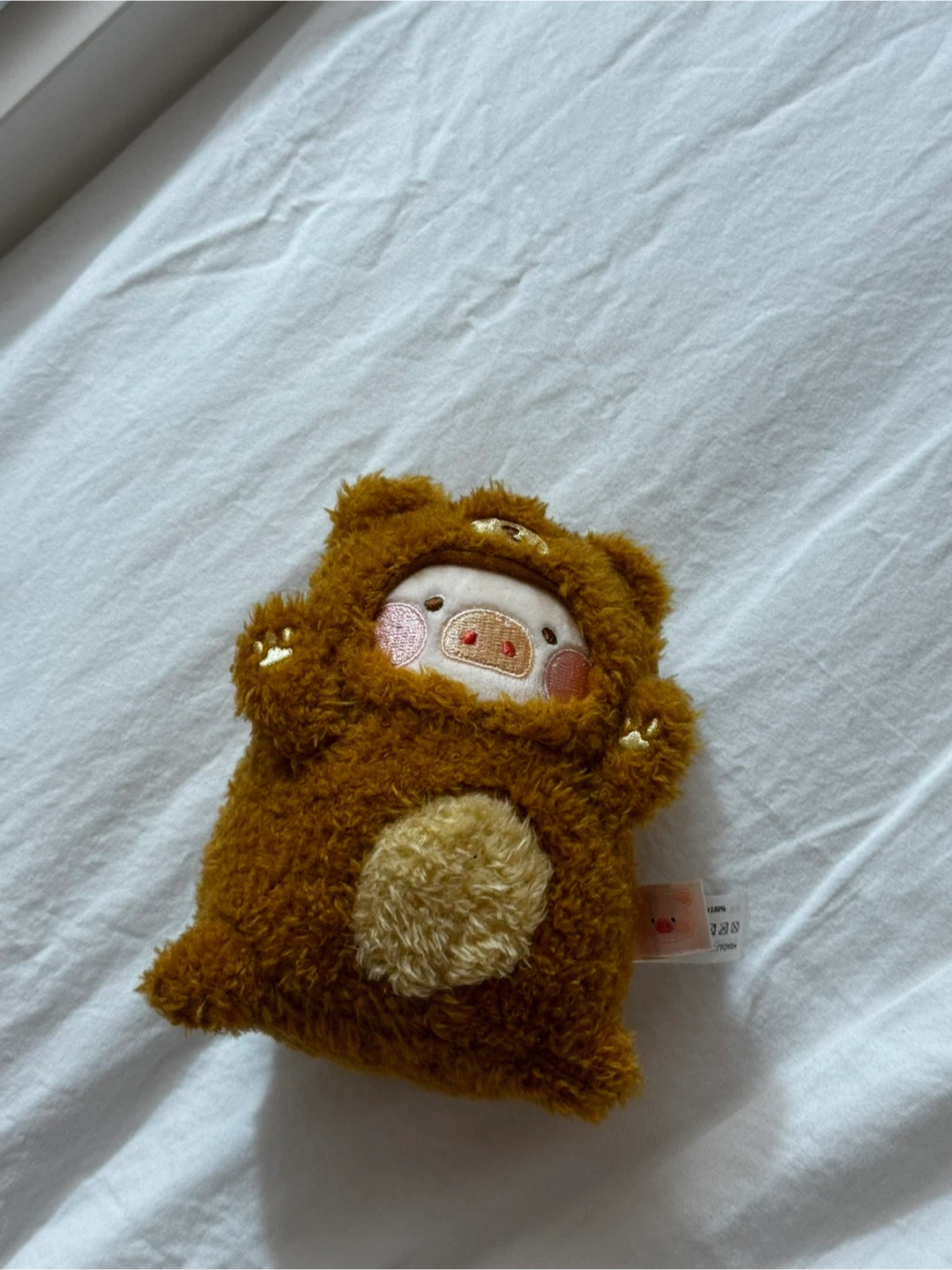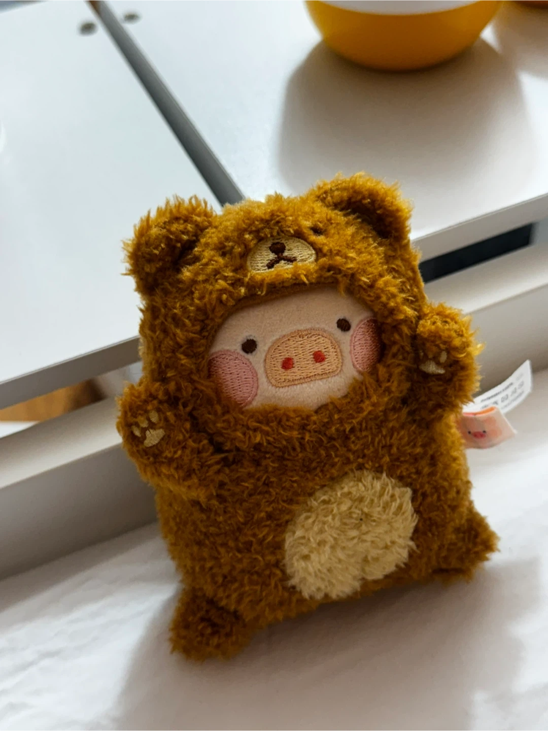 This is a cute plush toy of a pig wearing a fuzzy brown bear costume. It has embroidered facial features and paws. It's a fun little collectible or decoration!