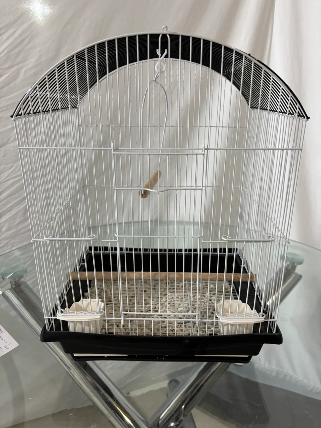 A small white wire bird cage with a black base. It includes two wooden perches and two white feeders. Ready for a new feathered friend! 18” H × 13” W × 11” D