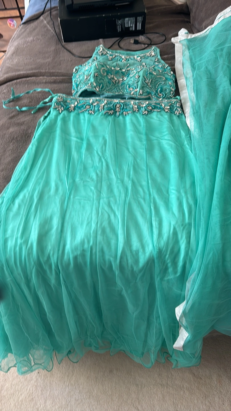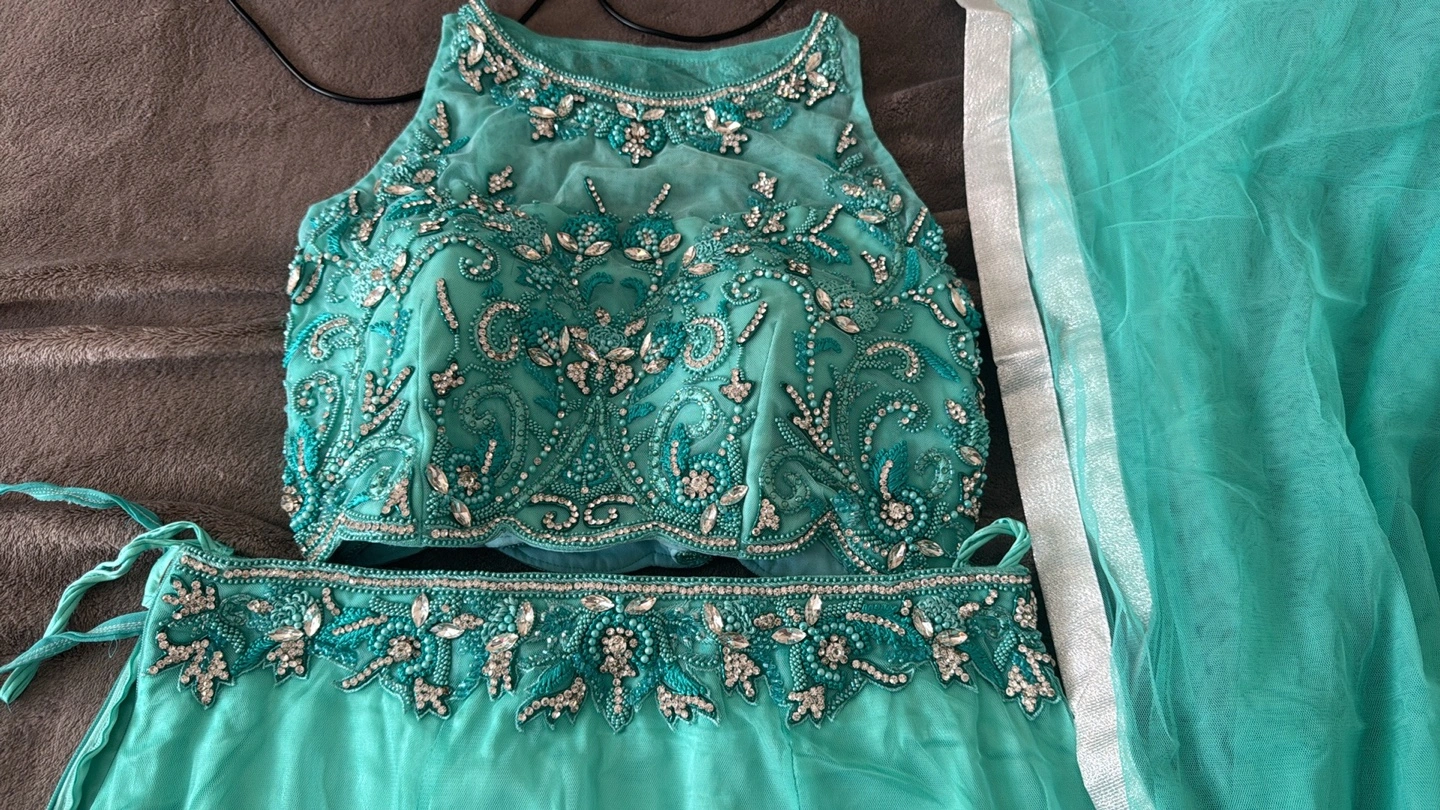 Aqua green with American rhinestone crystal work throughout the blouse and upper waist of the lengha skirt.