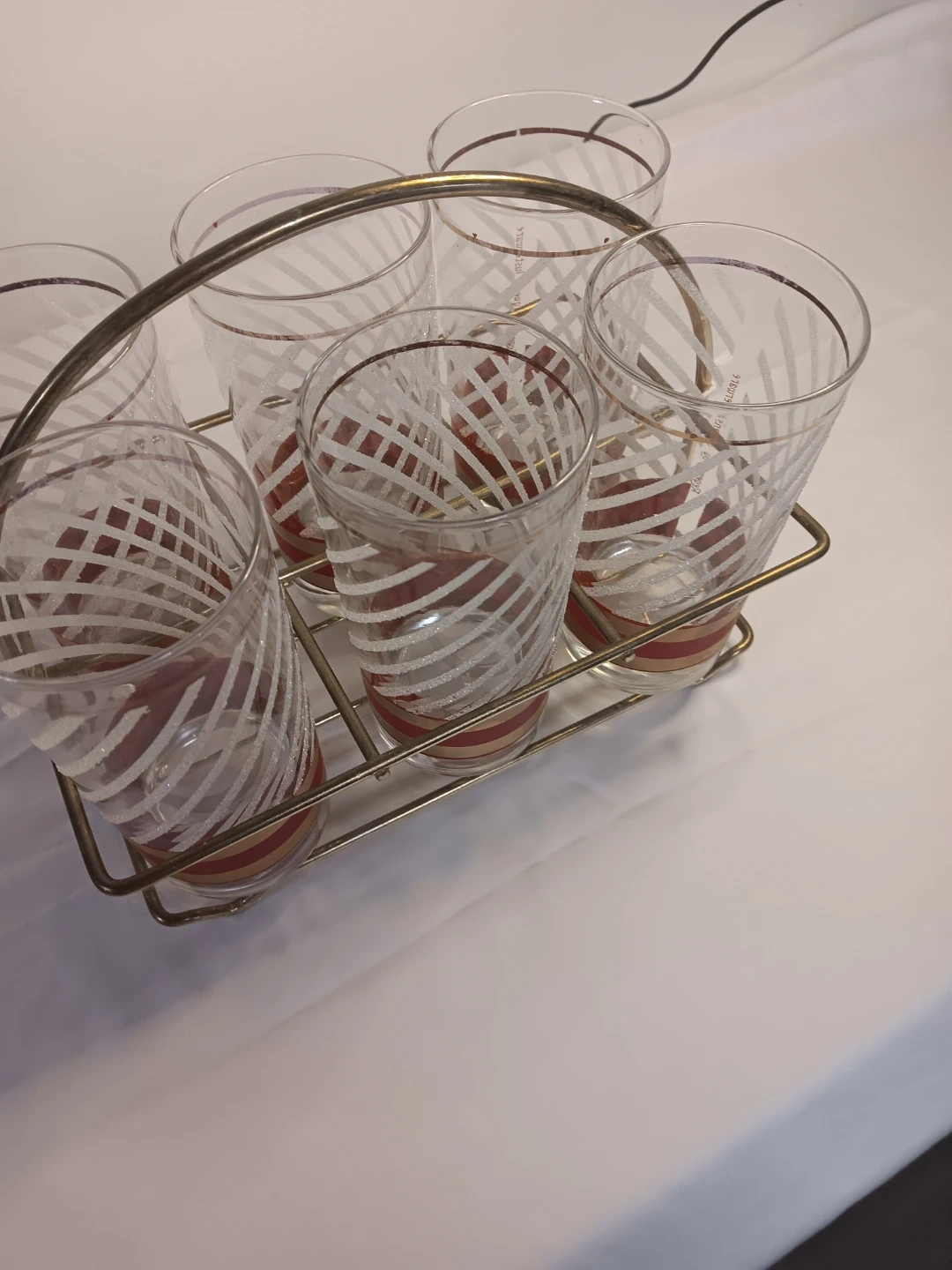 This is a set of six vintage drinking glasses. They feature a red and white striped pattern with gold trim. The glasses come with a metal carrier. They're perfect for serving beverages!
