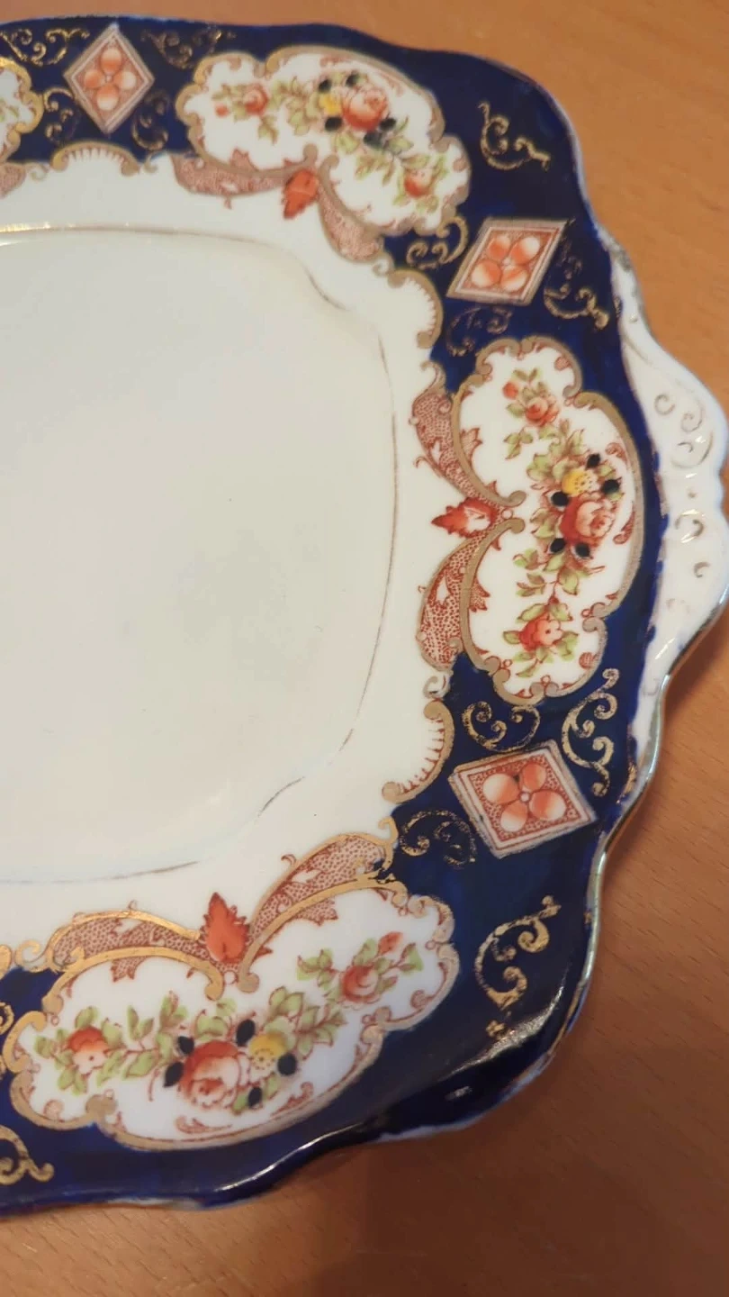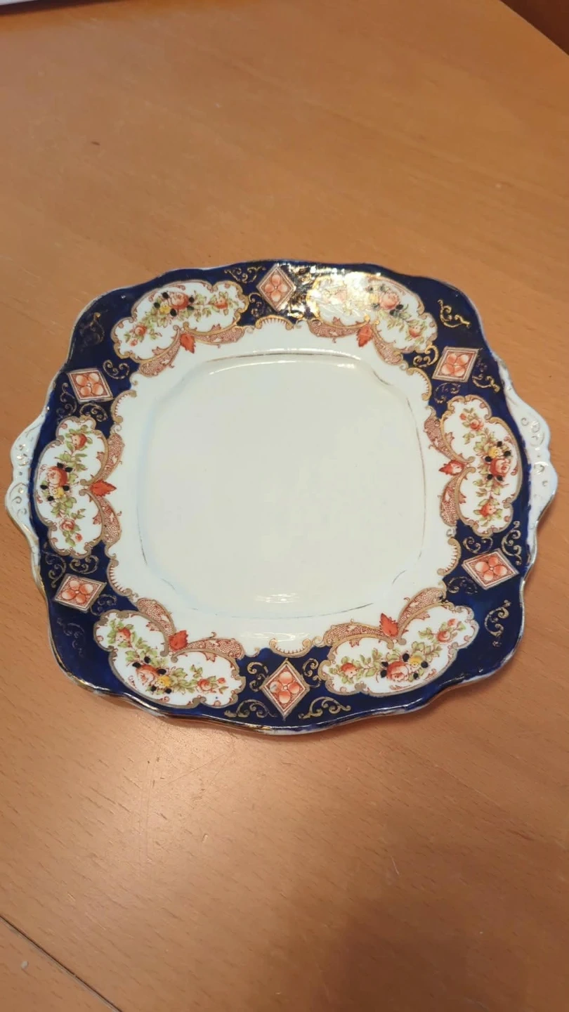A beautiful Royal Albert bone china plate from England. It features a floral pattern with a blue and gold border. This plate is perfect for serving desserts or as a decorative piece.