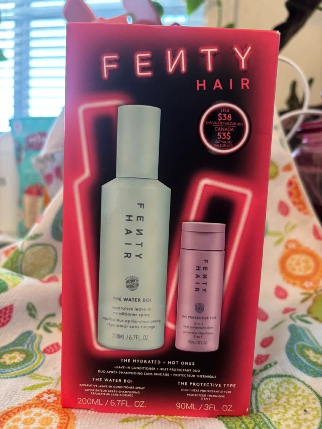 This Fenty Hair set includes The Water Boi reparative leave-in conditioner spray (200ml) and The Protective Type 5-in-1 heat protectant styler (90ml). The Water Boi quenches dry strands, detangles, and repairs. The Protective Type offers smooth, detangled, hydrated hair with 450°F heat protection. It's great for anyone looking to simplify their hair care routine while protecting against heat damage.