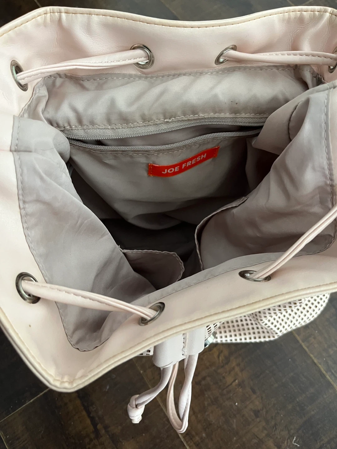 Joe Fresh pink backpack. It has adjustable shoulder straps and a drawstring closure with a flap. Lightly used. Perfect for day trips!