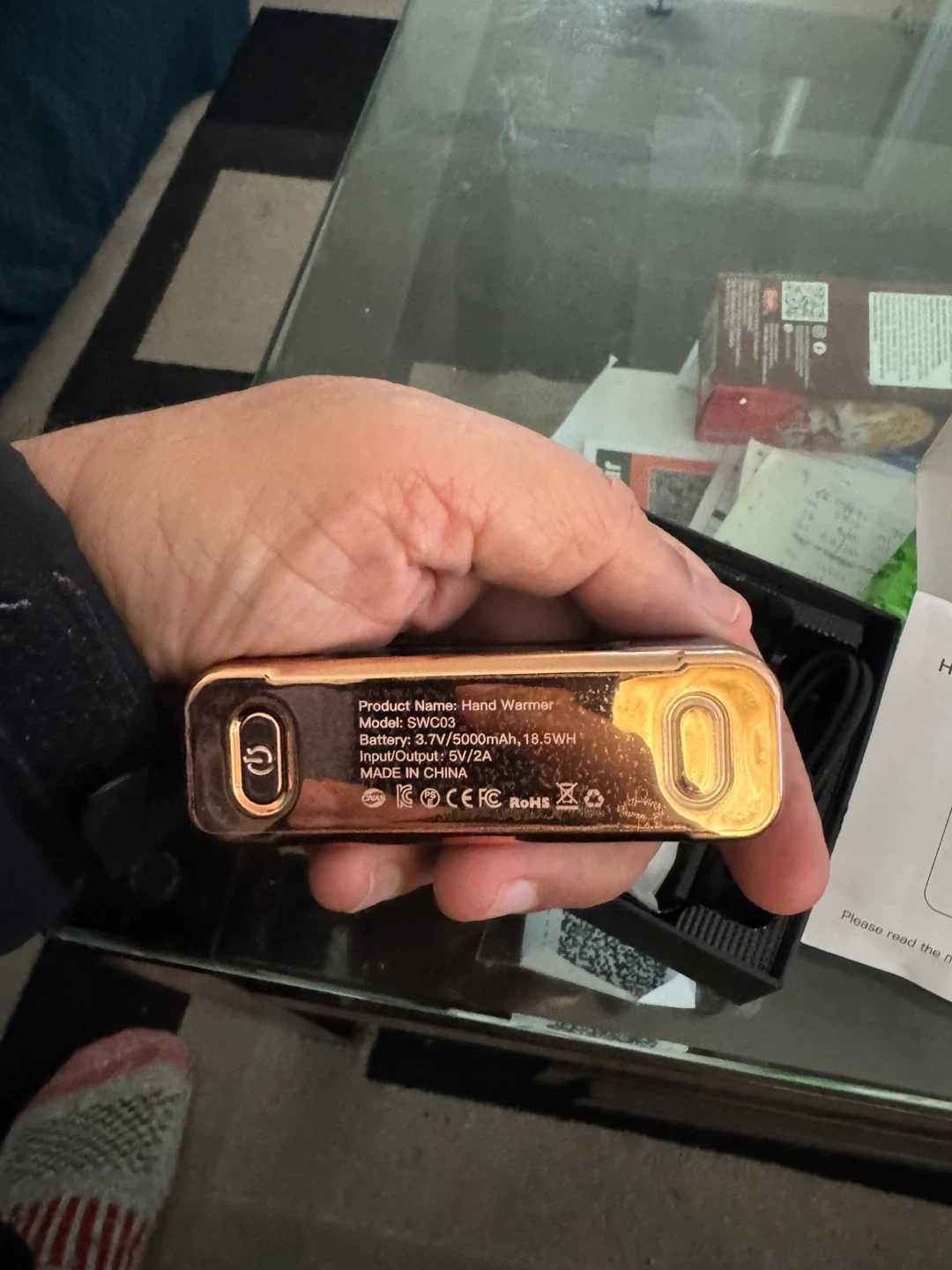 Includes two rechargeable hand warmers with a battery capacity of 5000mAh each. Digital display shows 100% charge. Input/Output 5V/2A.