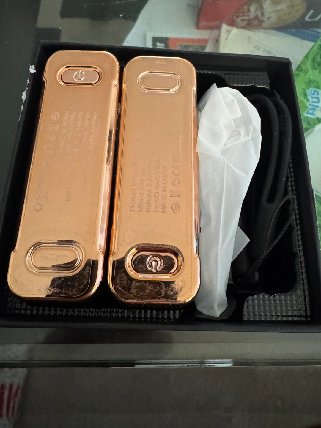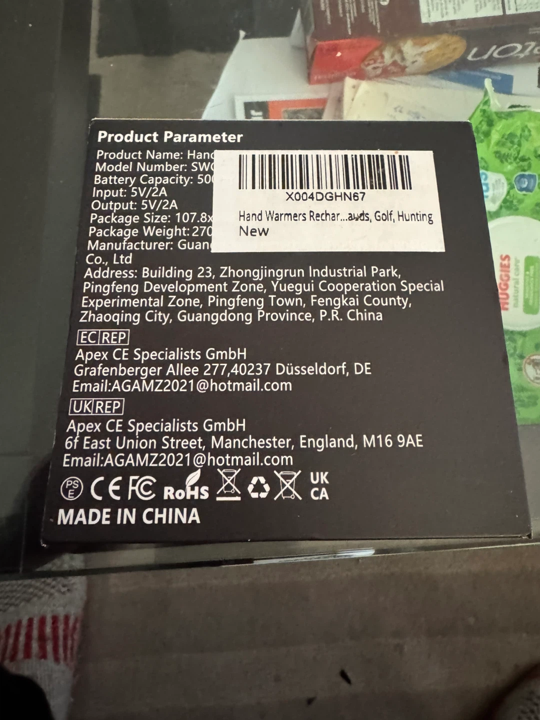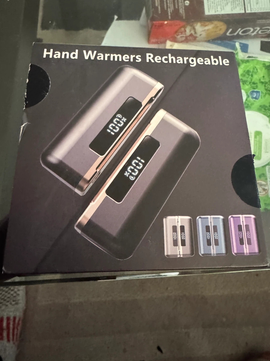 Includes two rechargeable hand warmers with a battery capacity of 5000mAh each. Digital display shows 100% charge. Input/Output 5V/2A.