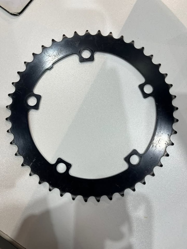 Great condition 44-tooth chainring with 130 BCD (bolt circle diameter). Ideal for road, track, or singlespeed setups. Teeth are in great condition and ready for installation. Tooth count: 44T Bolt Circle Diameter (BCD): 130mm Material: Alloy Condition: excellent shape Fits standard 5-bolt cranks Price: 15