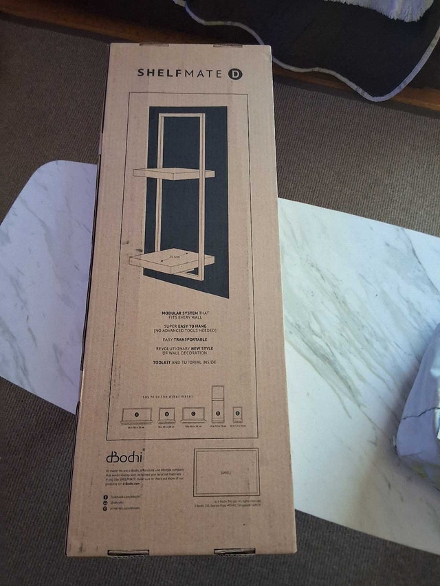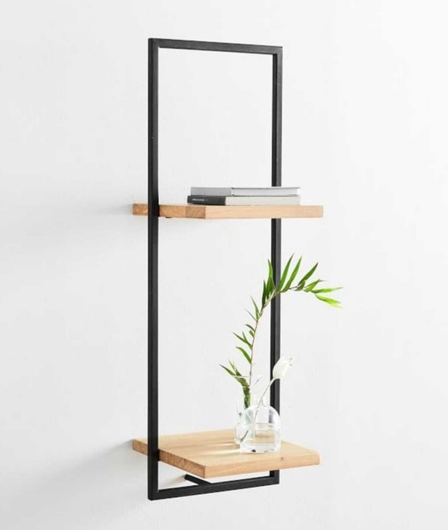 New in box, assembly required. Two- tier, oak/black iron wall shelf purchased from West Elm. Retailed for $80. See our other ads.
