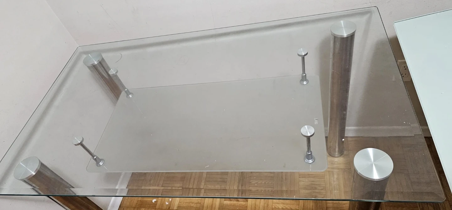 Dining table with a clear glass top and a lower shelf. It has four sturdy metal legs and silver accents. This table offers a sleek, modern look for your dining space.