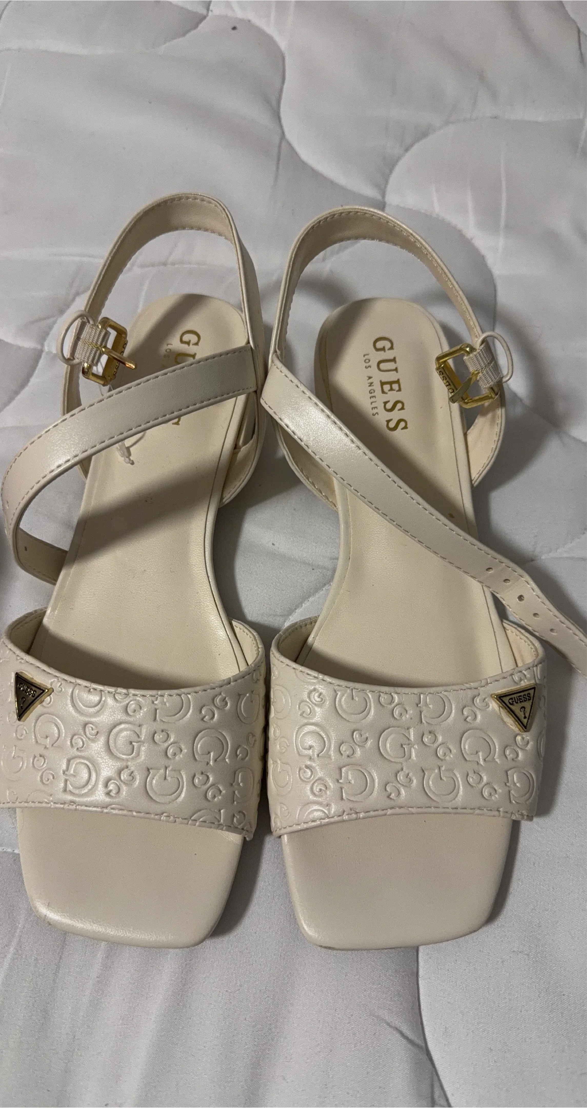 Cream Guess sandals with an all-over embossed "G" logo pattern. Features an adjustable ankle strap and a small gold-tone buckle. Perfect for a casual day out!