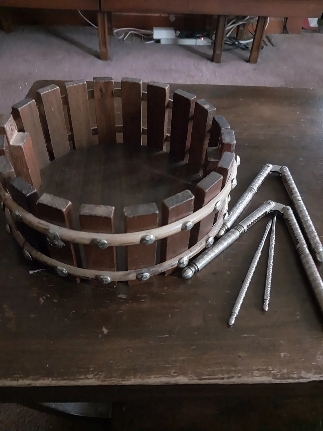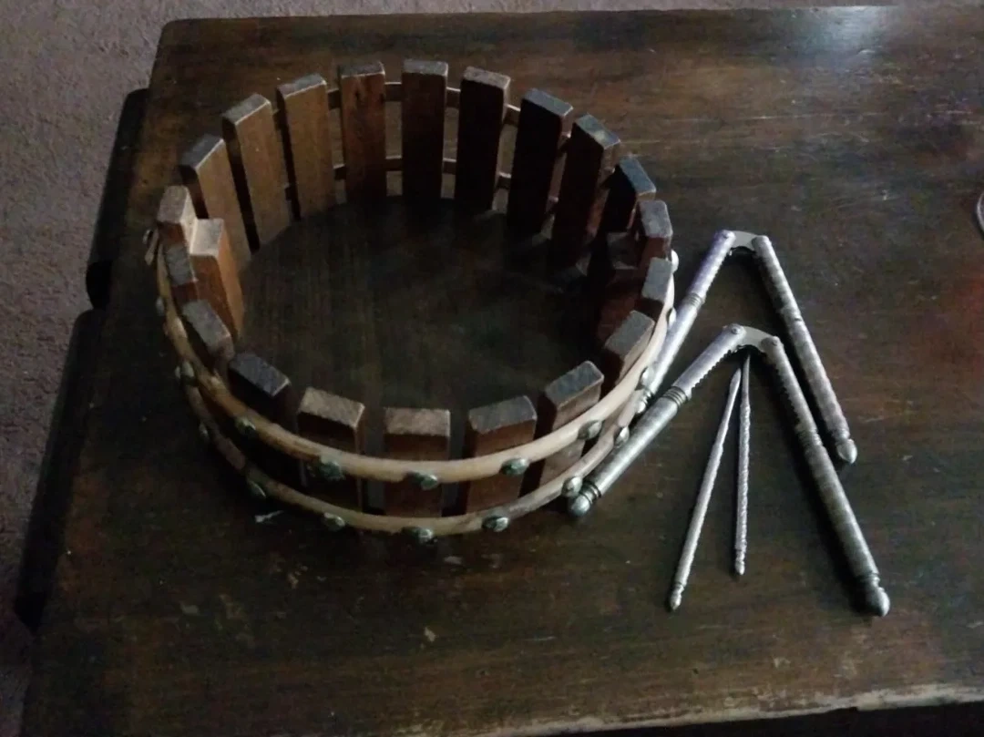 This is a rustic wooden bowl, perfect for serving nuts. It includes four decorative nutcrackers. The bowl's construction features a wooden base with metal accents around the rim. A nice set for any kitchen! 24" round.