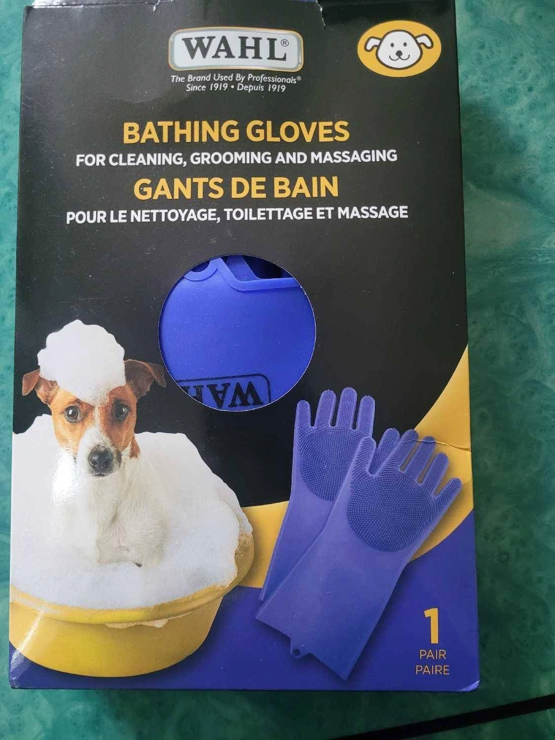 Wahl bathing gloves for pets, still brand new in the box! These gloves are designed for cleaning, grooming, and massaging your furry friend.