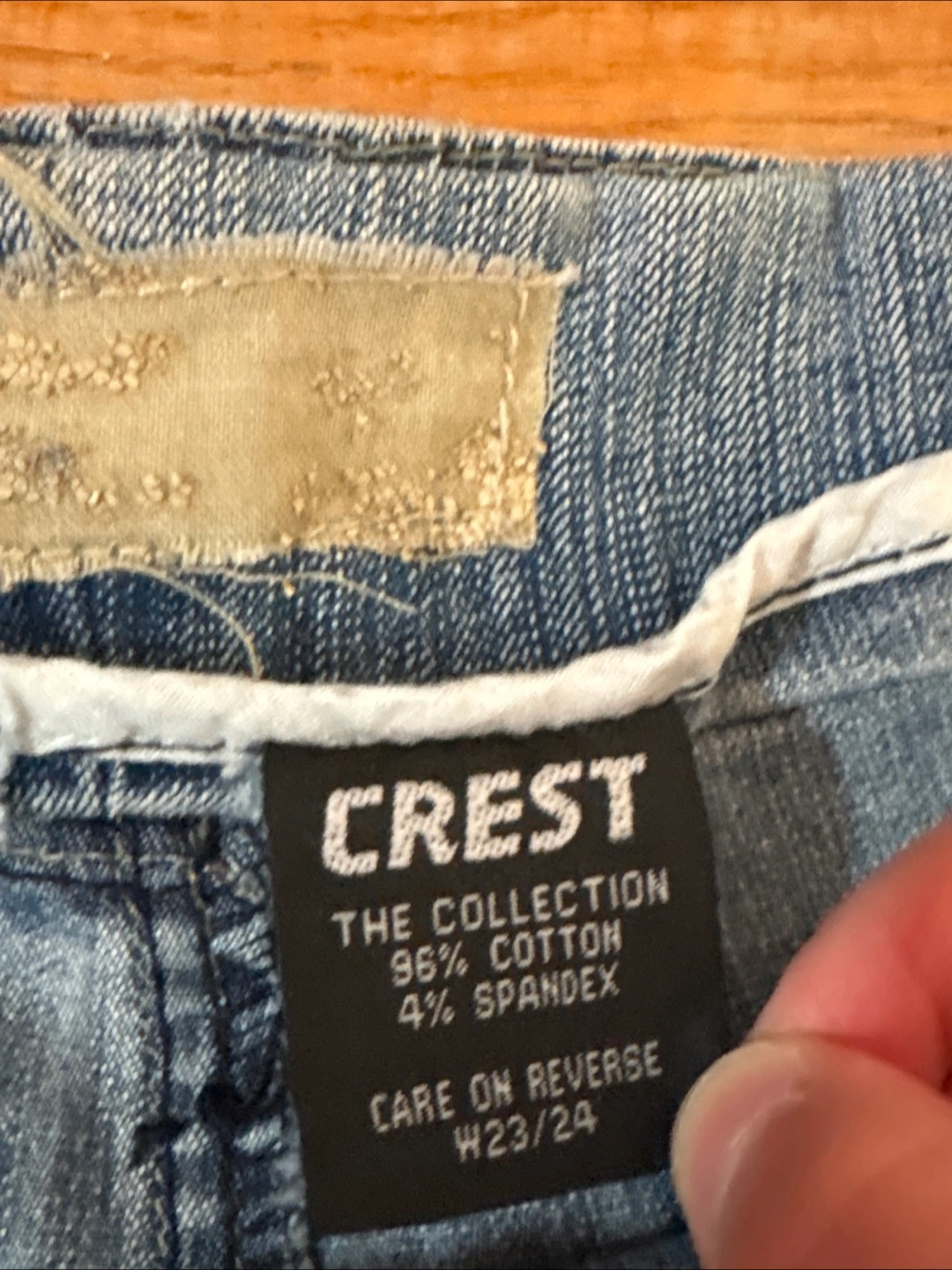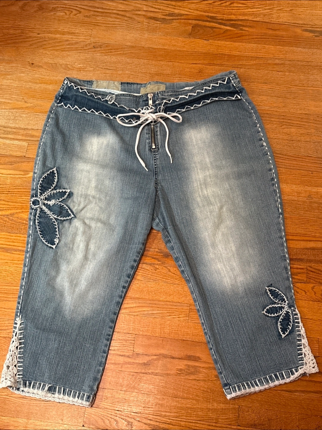 These are Crest Collection denim capri pants in a size W23/24. They're made of 96% cotton and 4% spandex. The pants have a unique design with floral appliques and lace detailing at the hem. Perfect for a casual, stylish look!