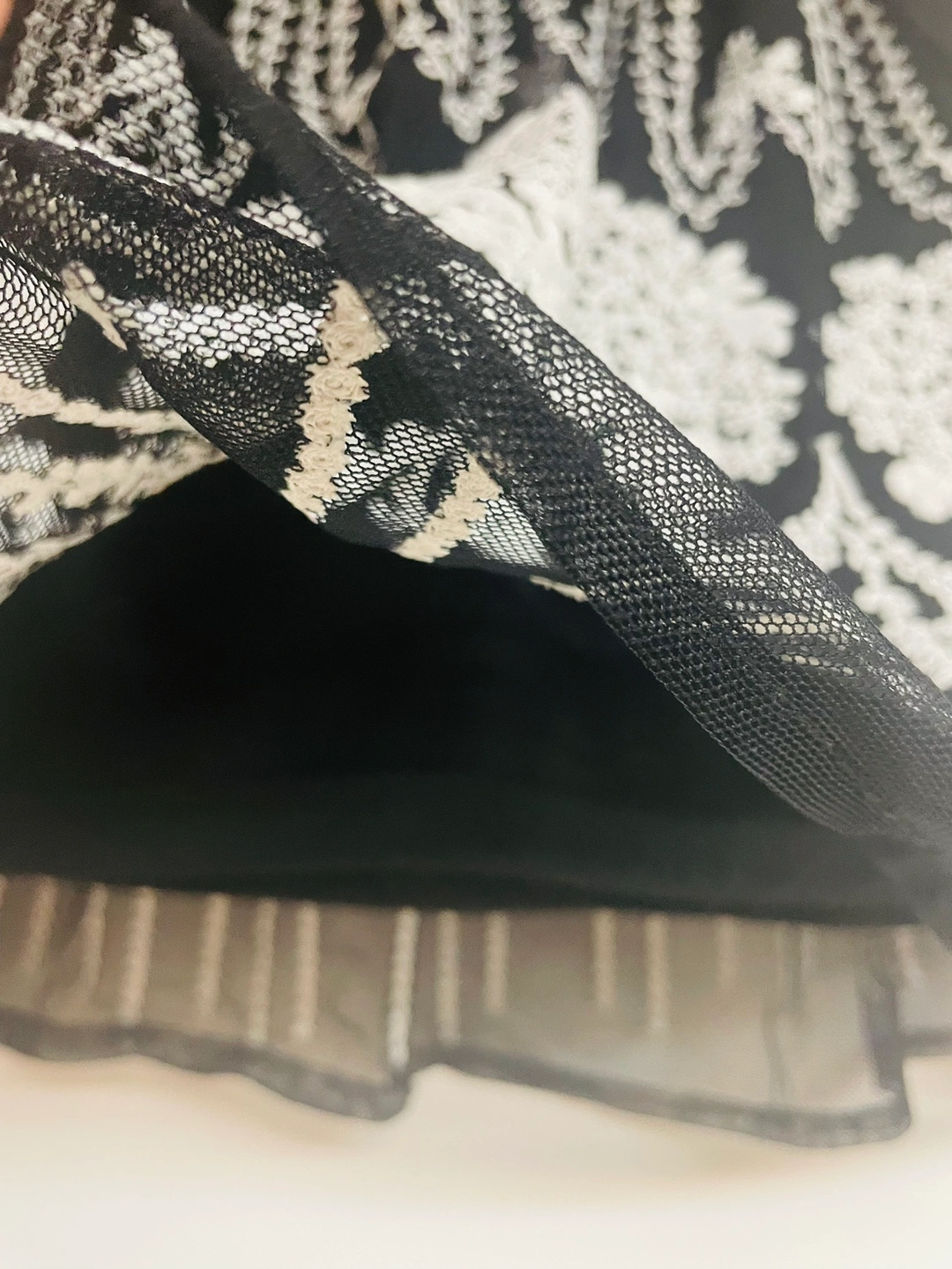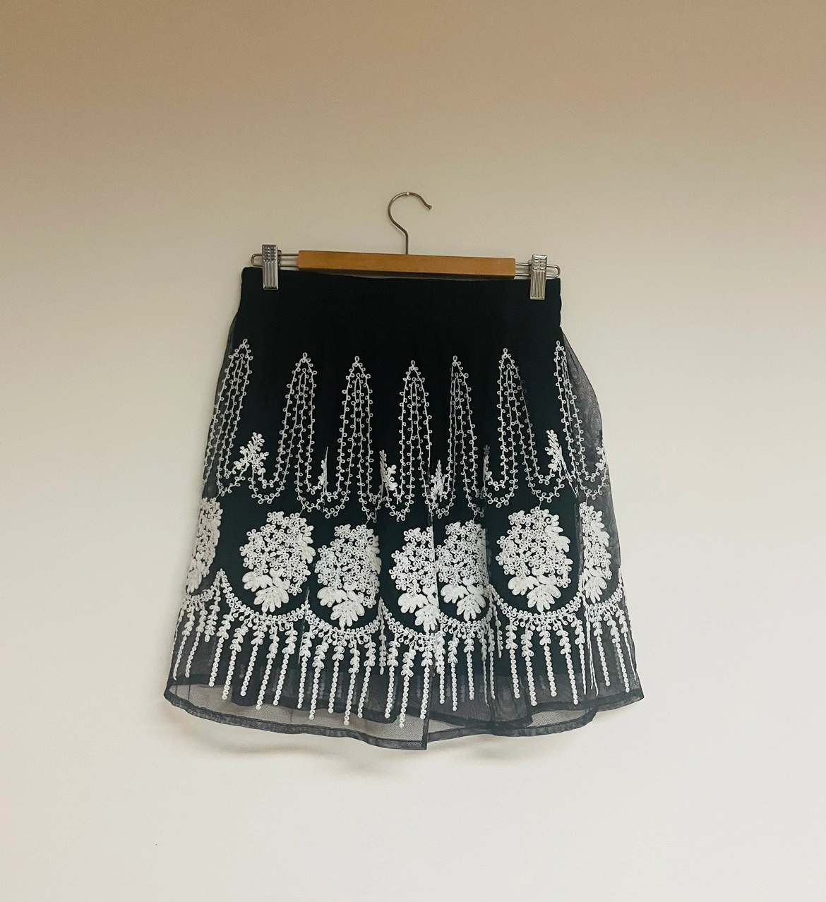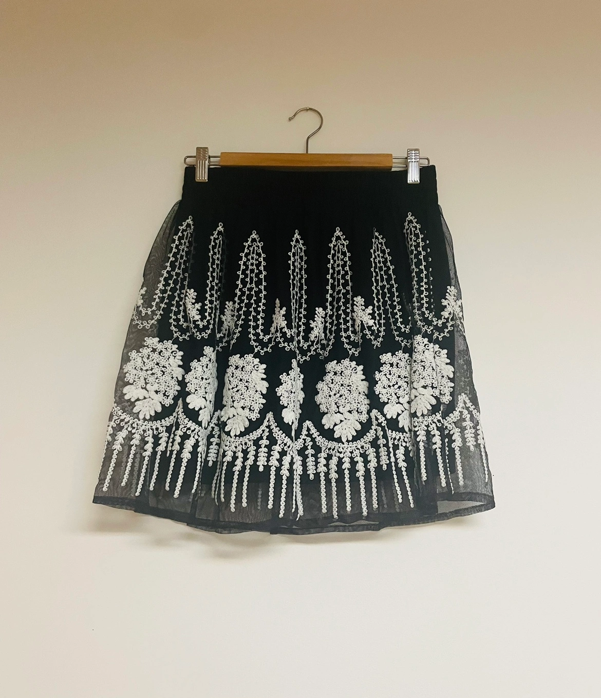 A black skirt with white floral embroidery. The skirt has a black lining with a mesh overlay.