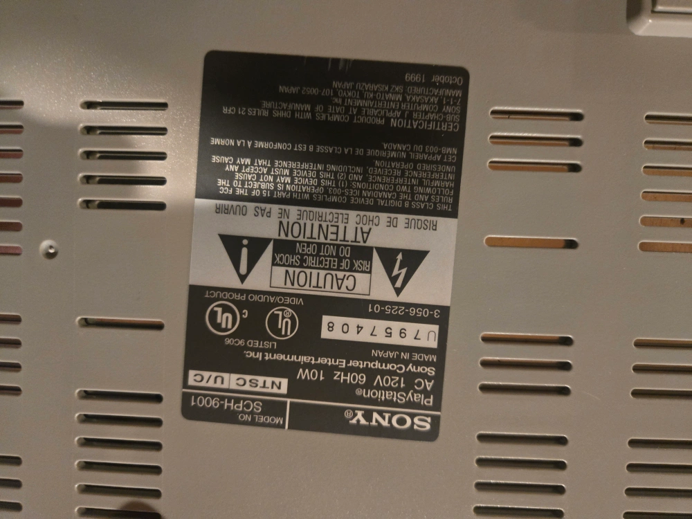Original Sony PlayStation console. Includes multiple games, controllers, and memory cards. Great for retro gaming. Cables included. Some wear and tear.