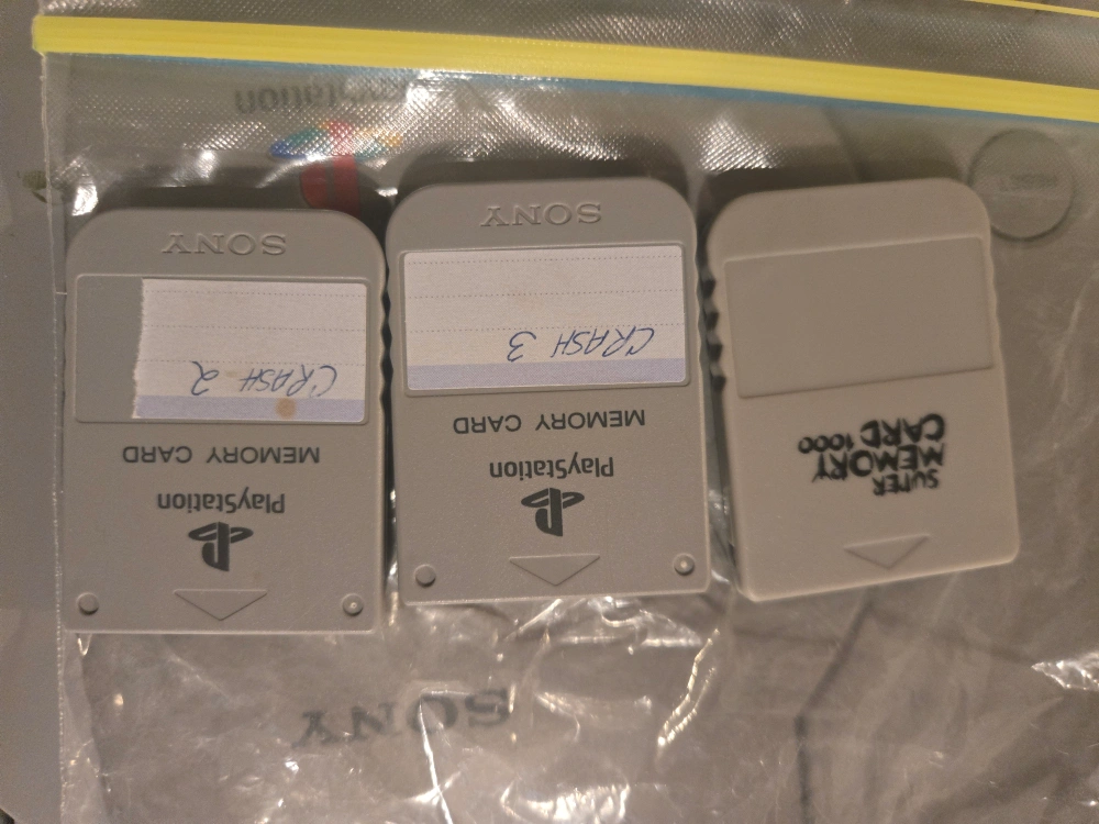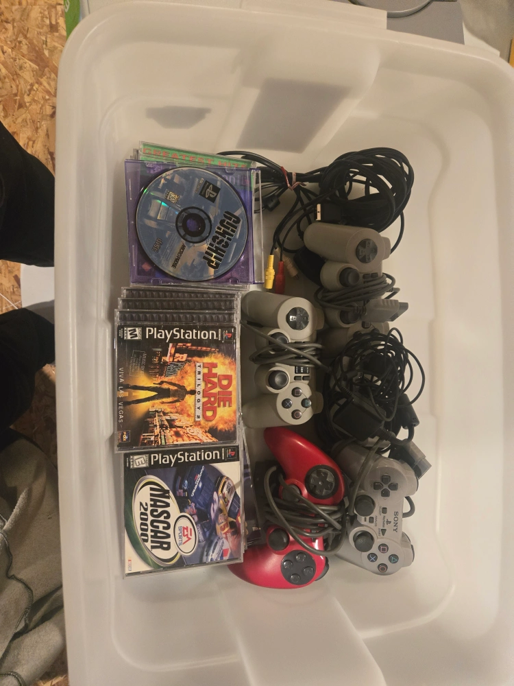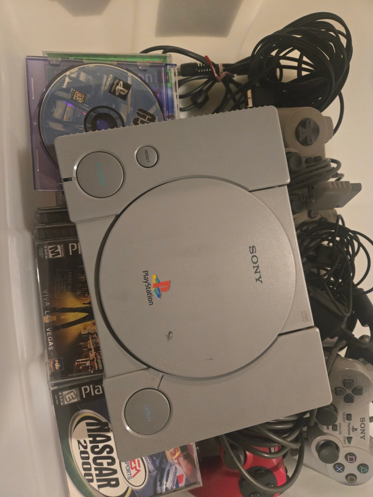 Original Sony PlayStation console. Includes multiple games, controllers, and memory cards. Great for retro gaming. Cables included. Some wear and tear.