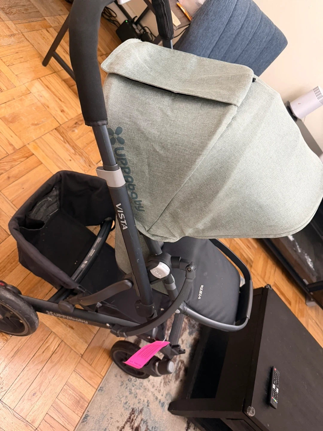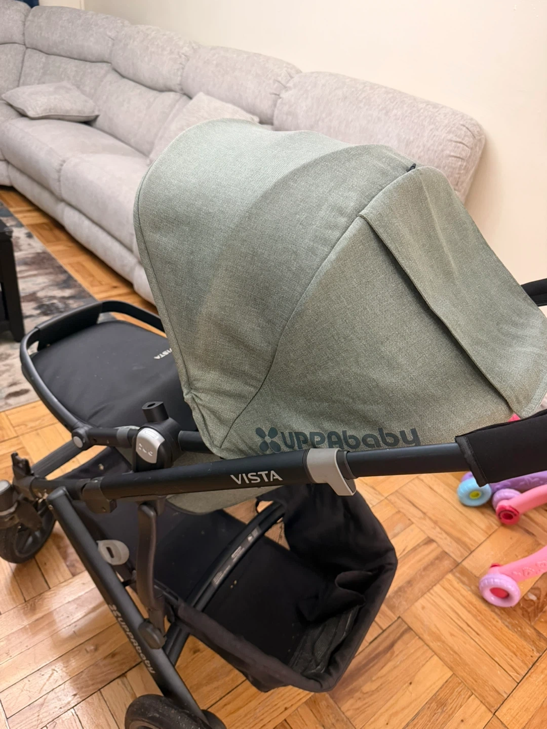 This is a UPPAbaby Vista stroller. It features a reversible toddler seat and a large storage basket. The canopy is adjustable for sun protection.