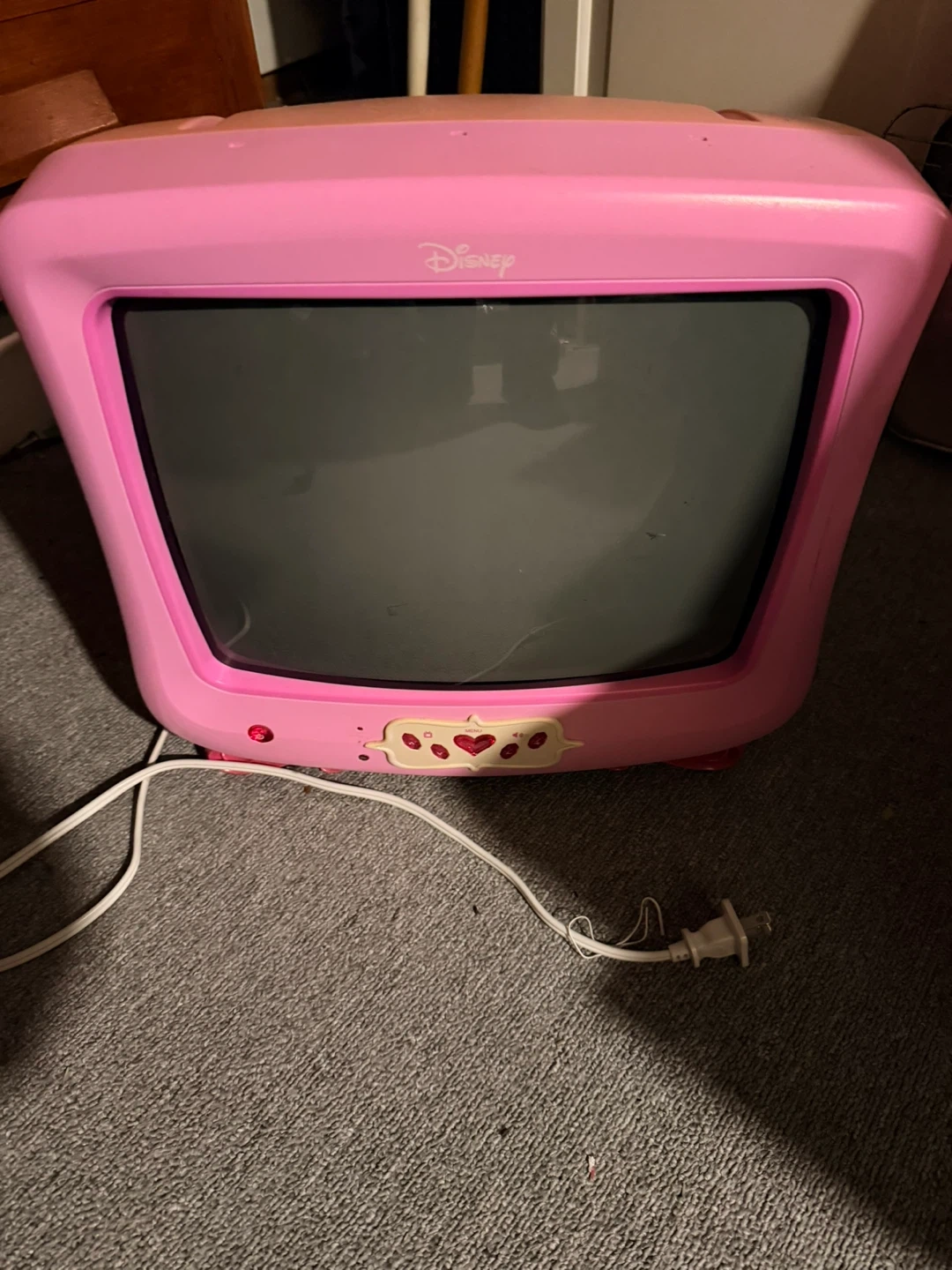 Cute pink CRT television with the Disney logo. It has a fun heart-shaped button design on the front. Great for a retro setup or a Disney fan!