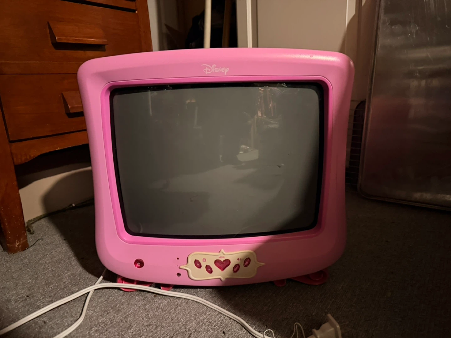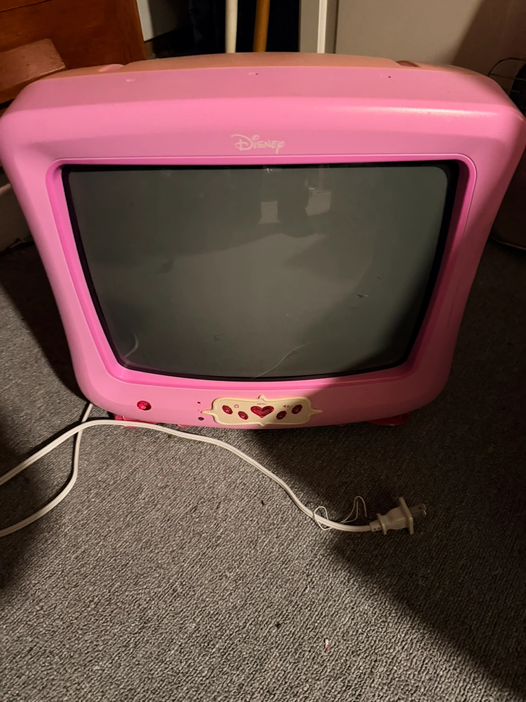 Cute pink CRT television with the Disney logo. It has a fun heart-shaped button design on the front. Great for a retro setup or a Disney fan!