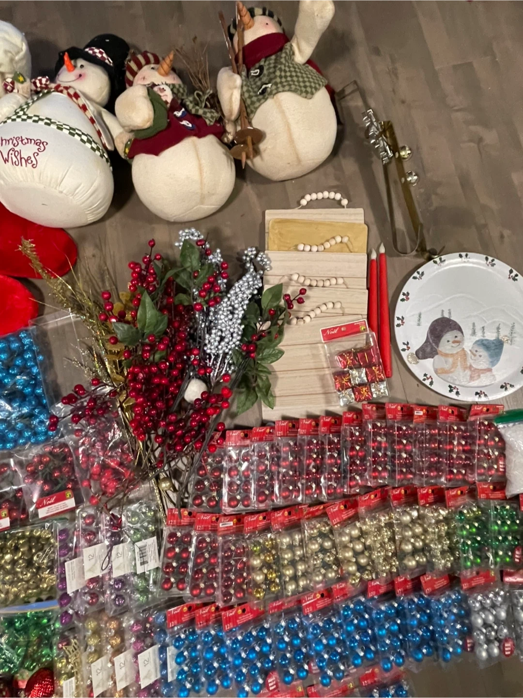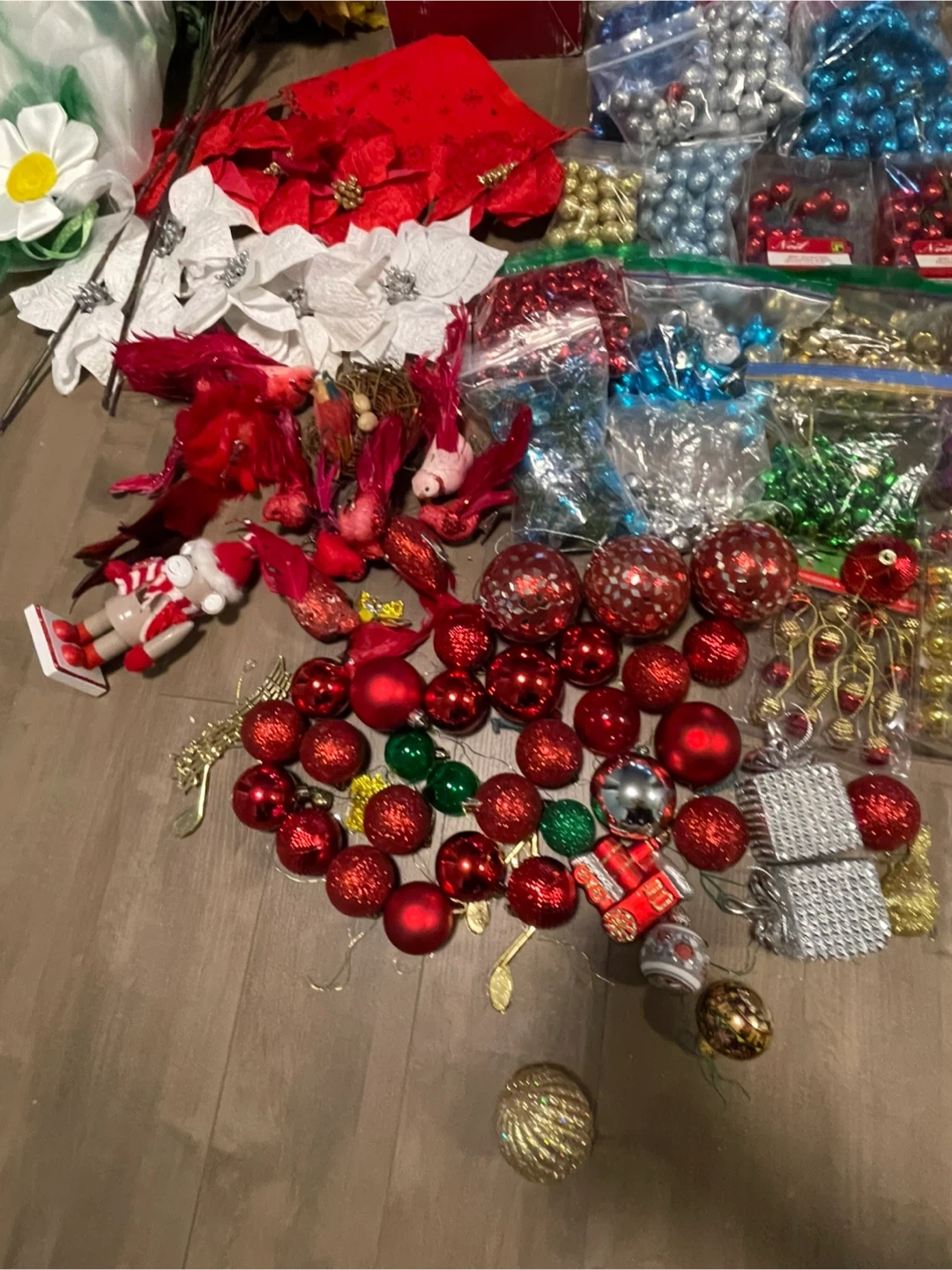 Massive collection of Christmas ornaments and decorations, including many packs of small baubles in red, gold, green, blue, and silver. Also includes decorative poinsettias, faux berries, fall leaves, and a festive Santa figurine. Plenty to deck out your tree and home this holiday season!